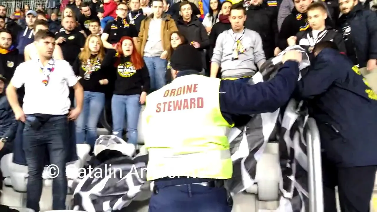 Banner confiscat la meciul România - Spania. Suporterii i-au fluierat pe oamenii de ordine - VIDEO