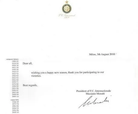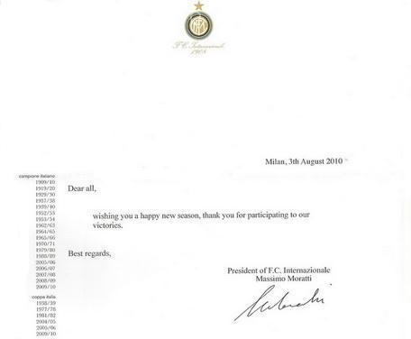 Mesajul a fost trimis de presedintele campioanei Europei, Internazionale Milano, in data de 3 august, potrivit site-ului oficial al echipei clujene.
