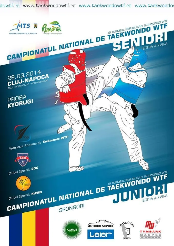 Federatia Romana de Taekwondo WTF, in parteneriat cu A.S EGO Club si Clubul Sportiv KWAN, organizeaza in data de 29 martie 2014, la Cluj-Napoca, cea de-a XVII-a editie a Campionatului National de Taekwondo WTF.