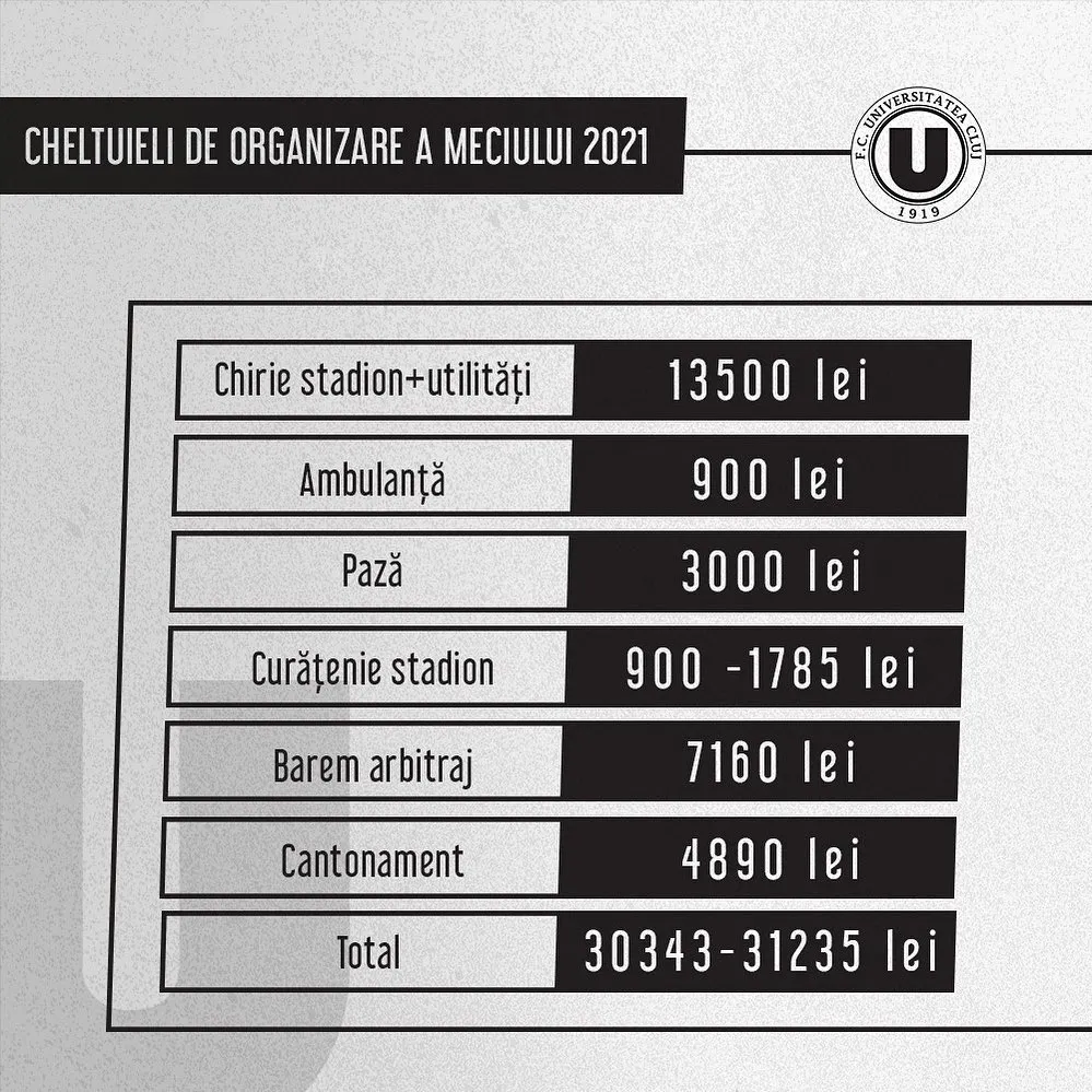 U Cluj a prezentat cheltuielile pe care le are cu organizarea unui meci pe Cluj Arena, în spiritul transparenței. Costul total este de 30.000 de lei, din care 13.000 de lei este chiria la stadion și 7000 de lei salariile arbitrilor.