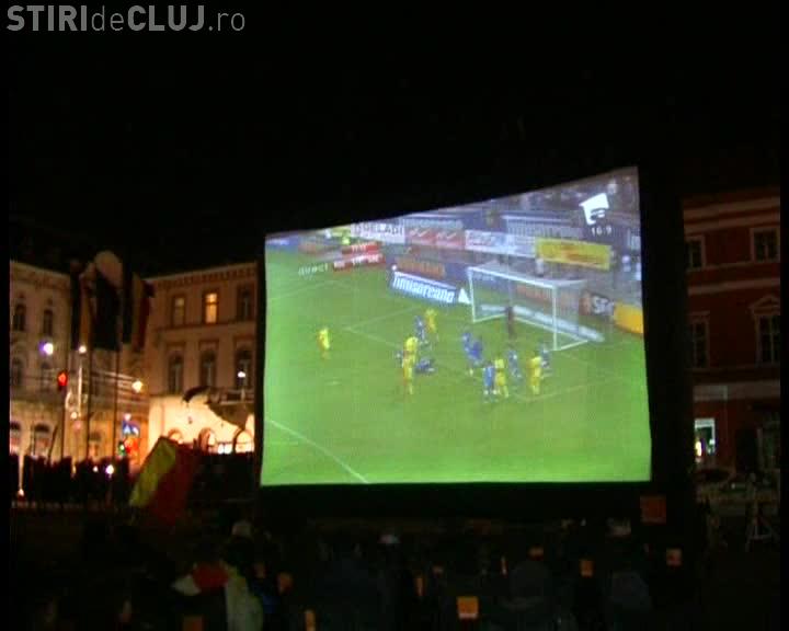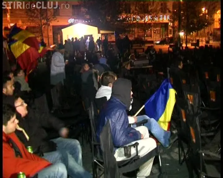 O mână de suporteri s-a adunat în Piața Unirii pentru a vedea meciul România - Grecia pe un ecran uriaș.