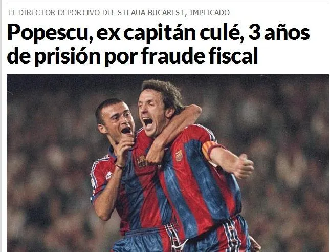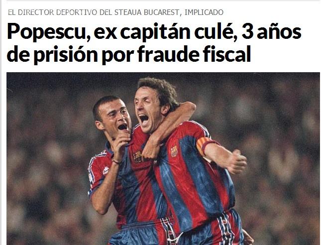 ”Popescu, fostul căpitan al Barcelonei, 3 ani de închisoare pentru fraudă fiscală”, scrie ”Marca”! ”Managerul Stelei Bucureşti, implicat şi el în acest caz”, notează cotidianul spaniol.