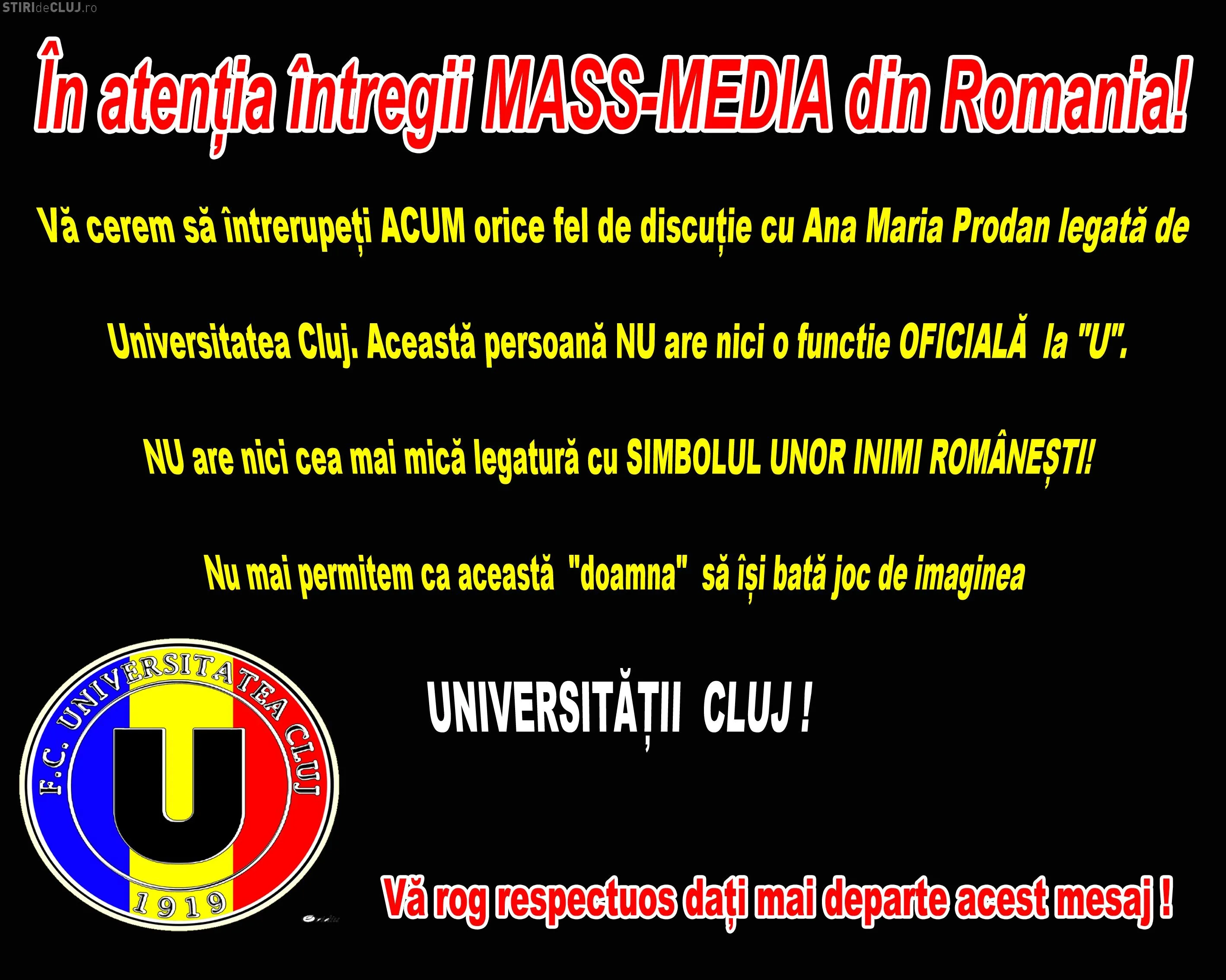 Într-o poza postată pe pagina de Facebook, aceştia au câteva mesaje pentru presă: "Vă cerem să întrerupeţi ACUM orice fel de discuţie cu Anamaria Proda legată de Universitatea Cluj. Această persoană NU are nicio funcţie OFICILĂ la "U".