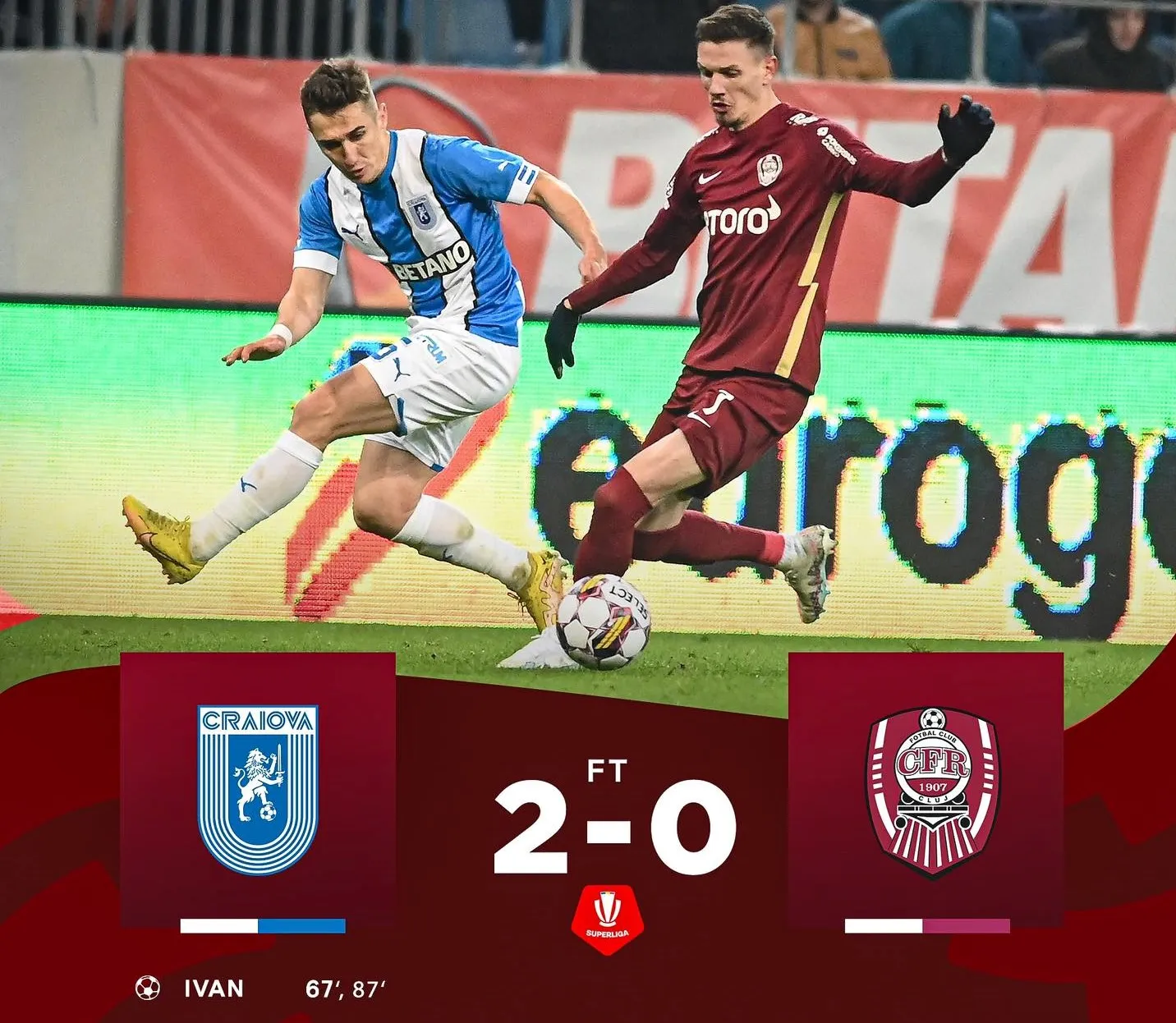 Cu toate acestea, tot oltenii au fost cei care au dat lovitura. În urma unei faze pornit din degajarea portarului și care a totalizat 4 pase, mingea a ajuns în centrul careului la Ivan, de unde atacantul l-a învins din nou pe Scuffet și a stabilit scorul final, CS U Craiova - CFR Cluj 2-0.
