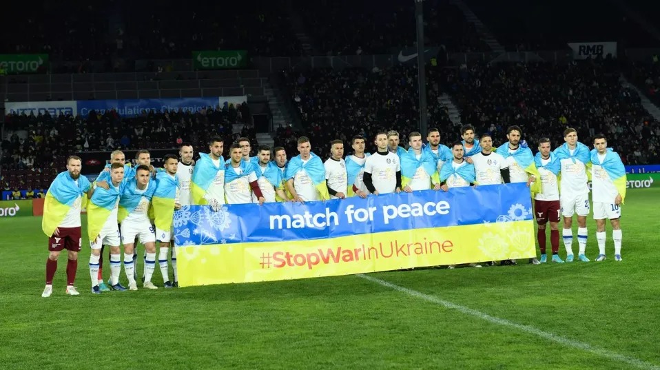 Jucătorii ambelor echipe au intrat pe gazon purtând steagul Ucrainei și au transmis mesaje care îndeamnă la pace. Emoția s-a simțit cel mai puternic în momentul în care toți cei prezenți la meci au ținut câteva momente de reculegere pentru cei care și-au pierdut viața în țara bombardată.