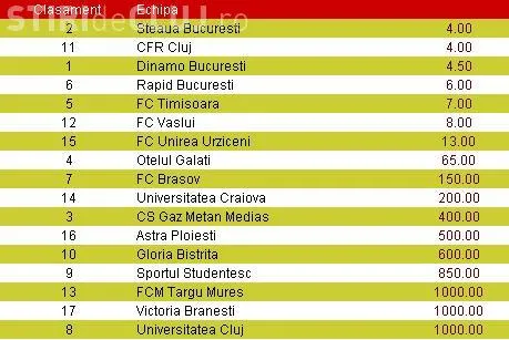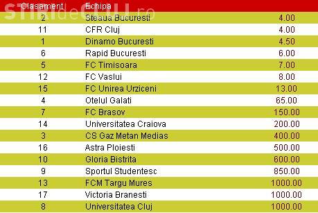 Dinamo Bucuresti are o cota de 4,5 de a castiga campionatul, iar Rapid Bucuresti cota 6.