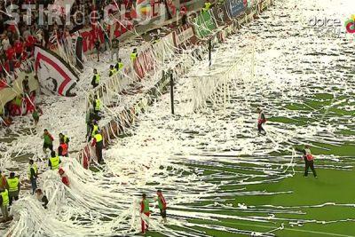 Suporterii au aruncat cantități uriașe de hârtie pe teren, fiind necesară întreruperea meciului.