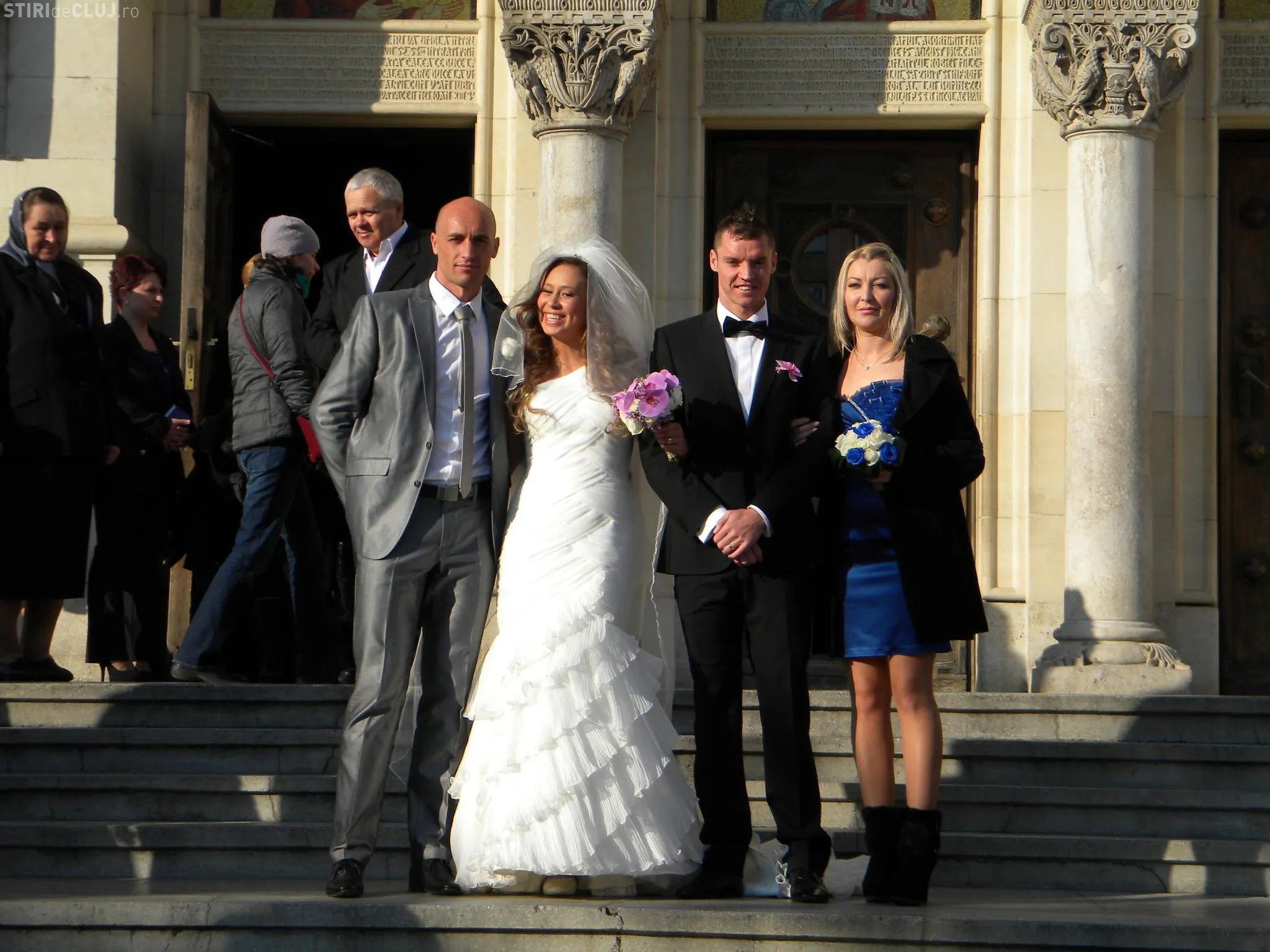 Cristi Bud si proaspata mireasa, Mihaela, au fost insotiti in fata altarului de rude, prieteni si de nasi, fundasul CFR Cluj, Gabi Muresan, si sotia acestuia.