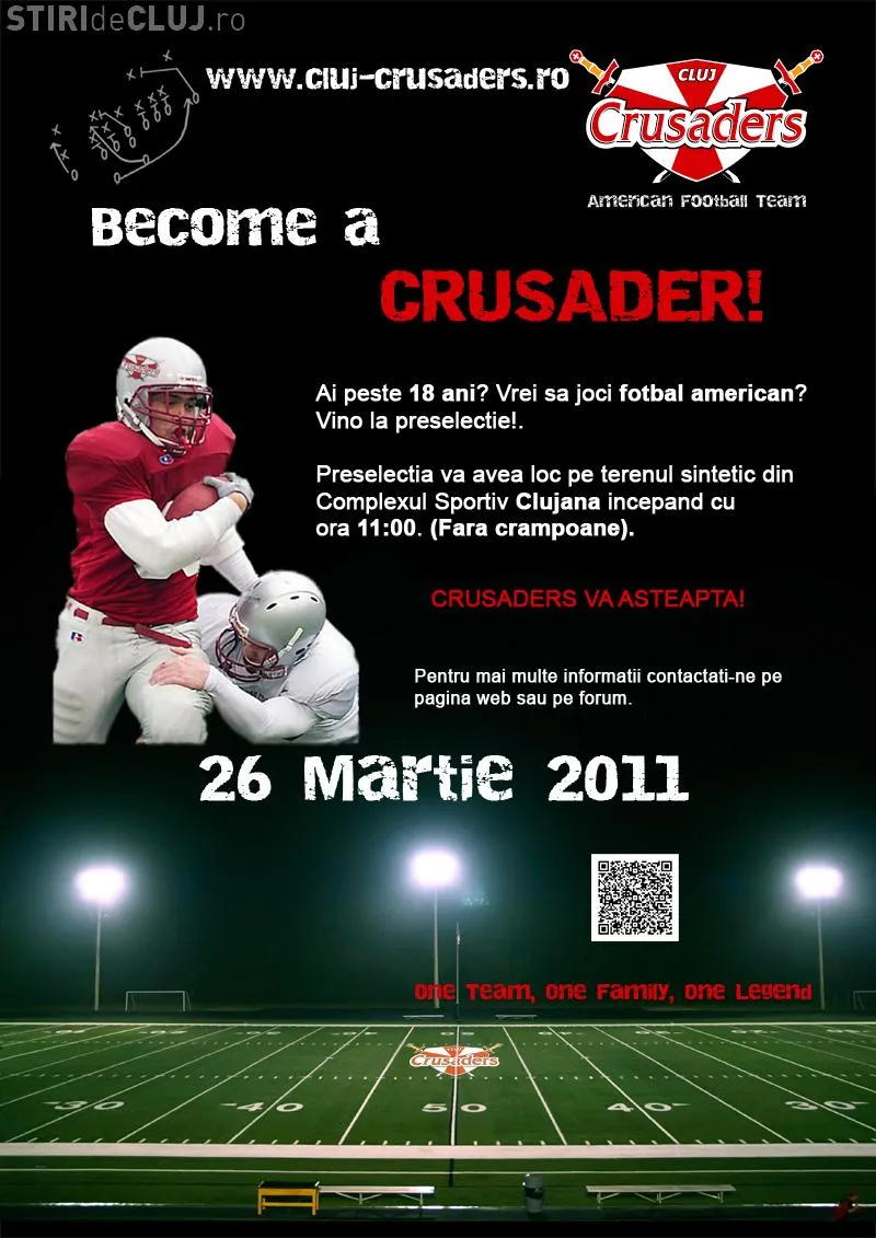 Echipa de fotbal american, Crusaders Cluj, organizeaza o sesiune de recrutari in data de 26 martie, ora 11.00, la Complexul Sportiv Transilvan ( fosta Clujana).