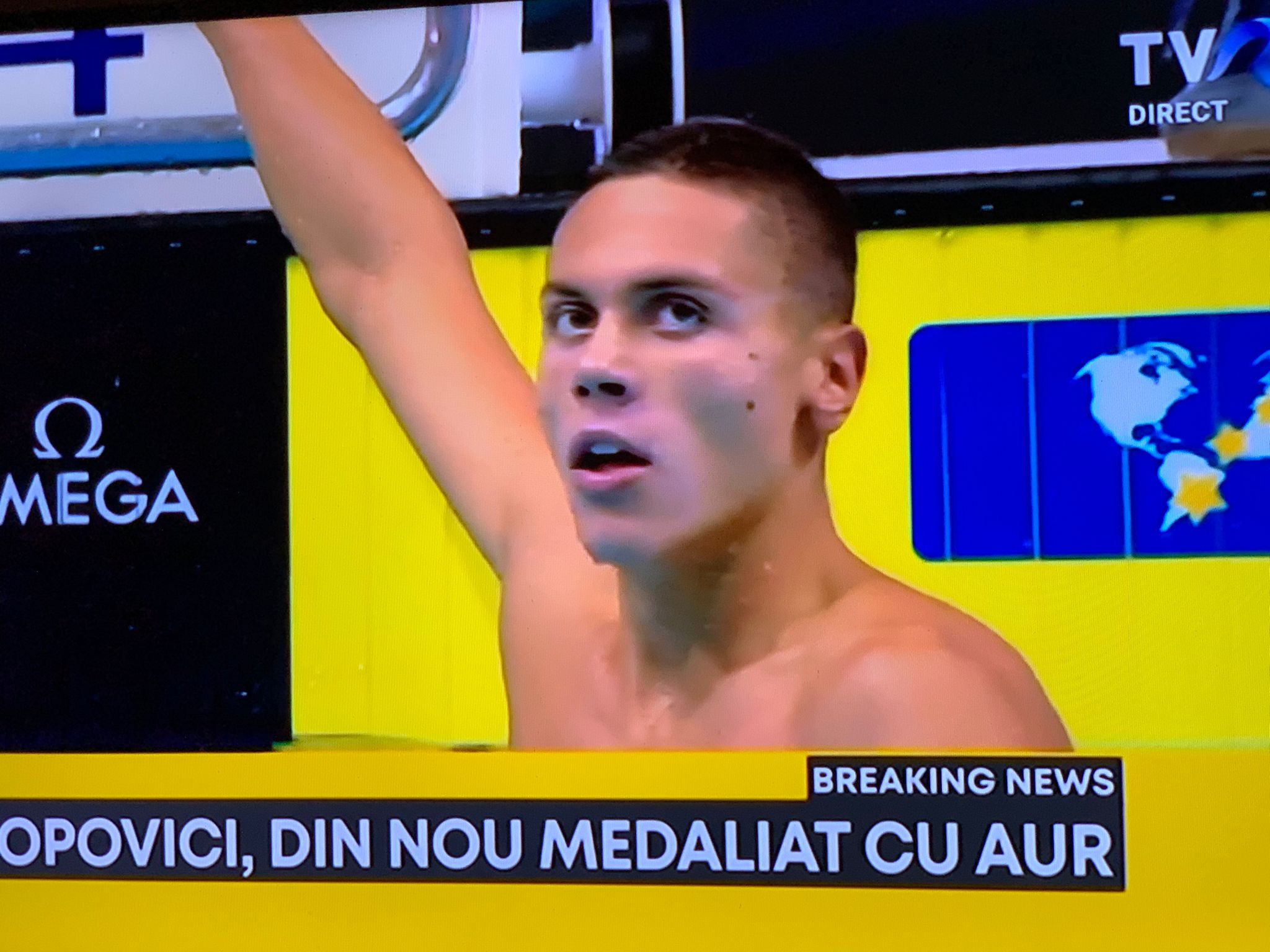 Românul a câștigat și medalia de aur din proba de 200 de metri, fiind deja o legendă în lumea înotului. David Popovici are numai 17 ani.