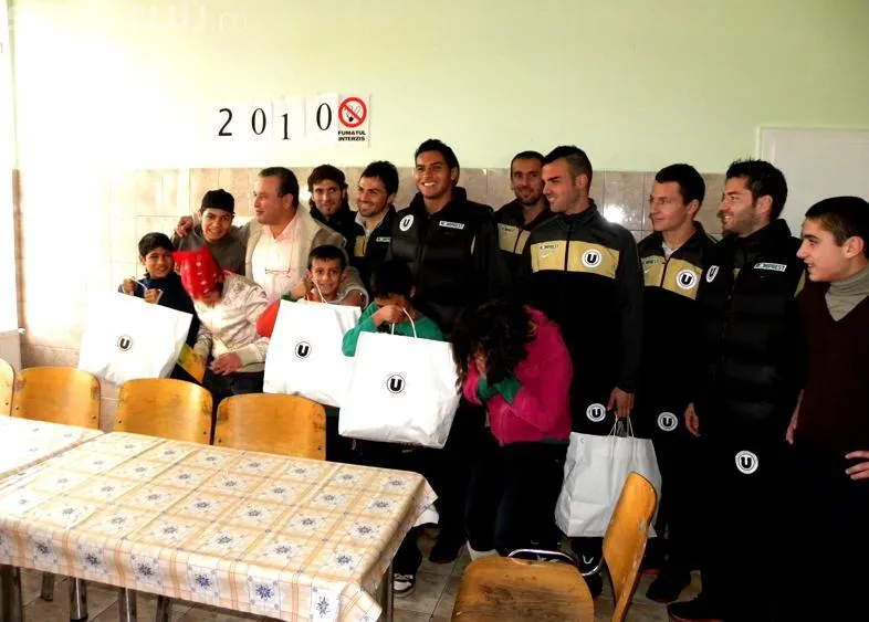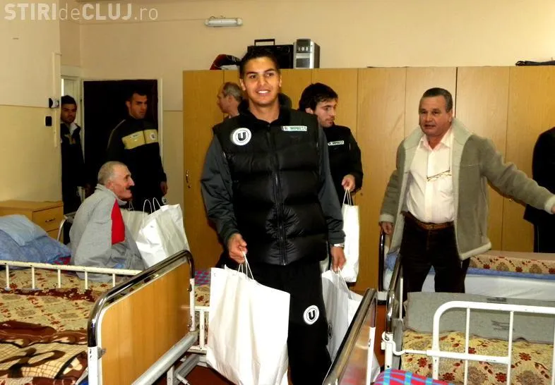 Fotbalistii de la U Cluj au jucat astazi rolul Mosului si au dus cadouri copiilor de la centrele Directiei Generale de Asistenta Sociala si Protectia Copilului Cluj Napoca.