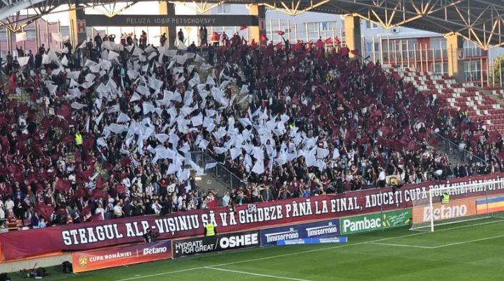 „Steagul alb-vișiniu să vă ghideze până la final, aduceți Cupa României înapoi în deal”, a fost mesajul afișat de fanii CFR-ului, în timp ce ultrașii sibieni au răspuns cu un banner la fel de inspirat: „Sibiu, mândră cetate, îți aducem trofeul la noapte”.