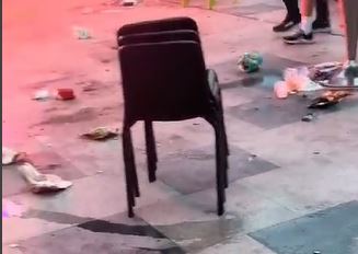 În filmarea făcuta de un tânăr se pot vedea ambalaje de tot felul, resturi de alimente, băuturi vărsate pe mese, pe scaune și pe podea.