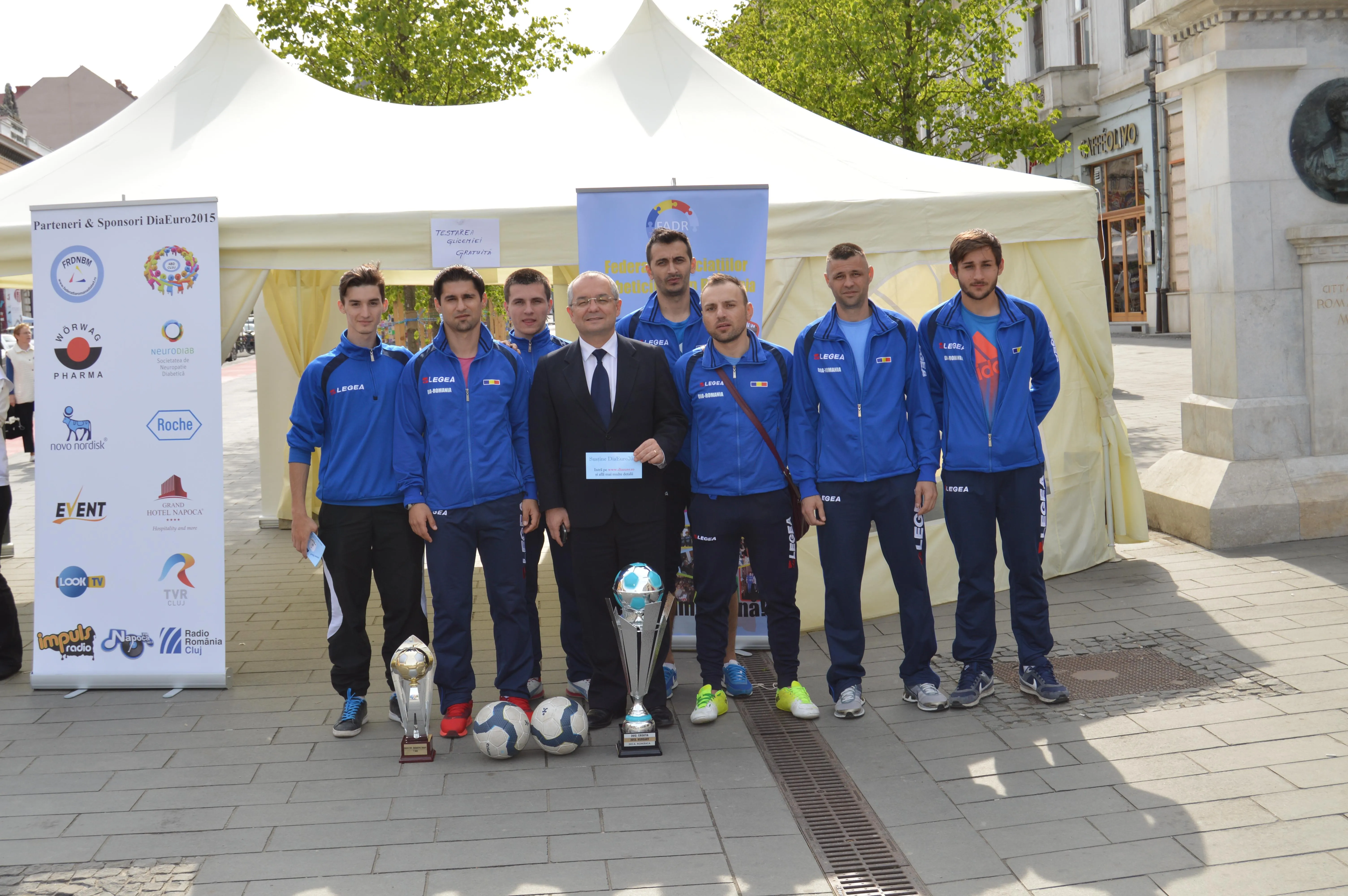 Jucătorii naționalei României a persoanelor cu diabet au jucat ”miuța” cu Boc în centrul Clujului. Azi au meci și cu fostele glorii ale lui ”U” FOTO