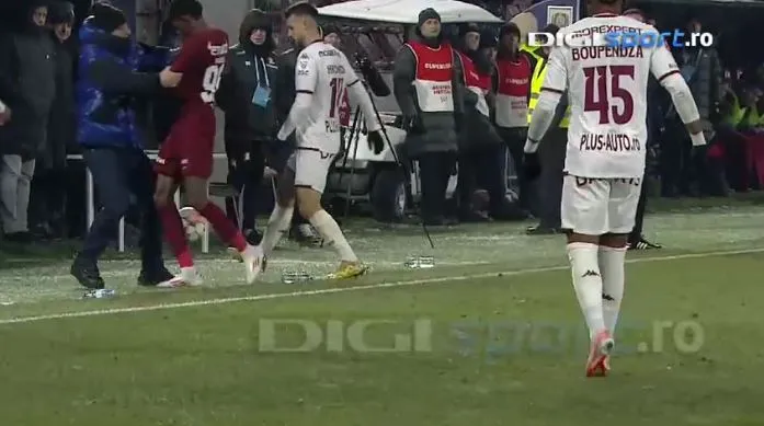 În minutul 50, la o fază care se desfășura în lateralul terenului, pe partea cu băncile de rezerve, mijlocașul CFR-ului a încercat să protejeze mingea care era pe cale să iasă din teren, urmând o aruncare în favoarea echipei sale.