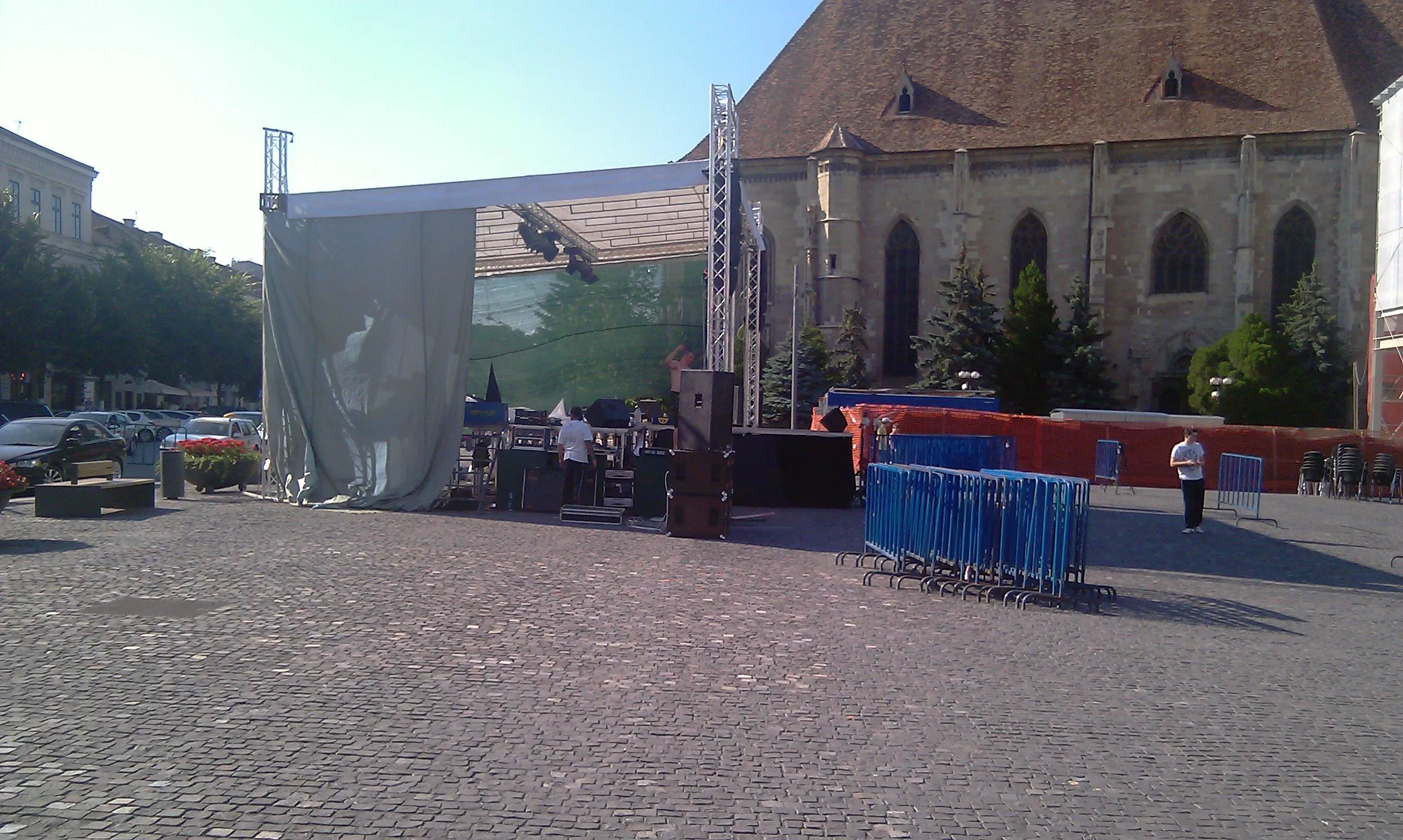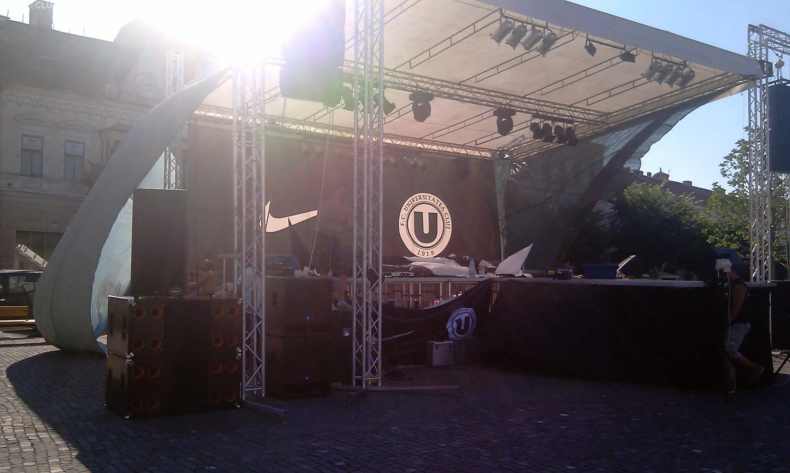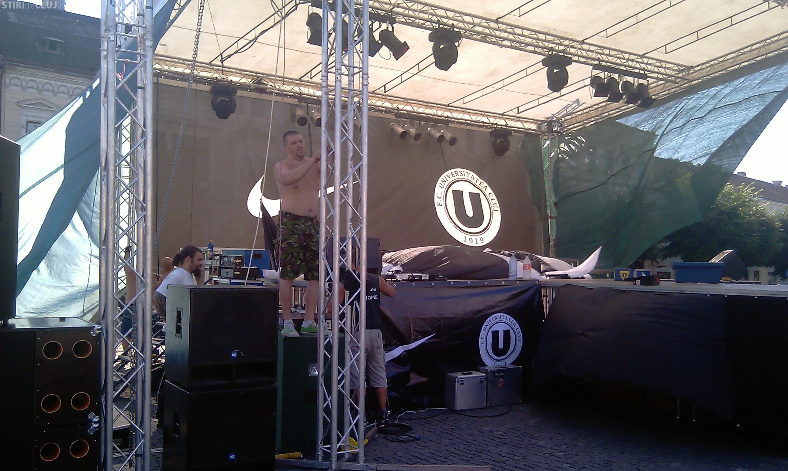 Lucrarile la ridicarea scenei din Piata Unirii au inceput azi dimineata. In fundal a fost montat un banner cu sigla de la U Cluj.