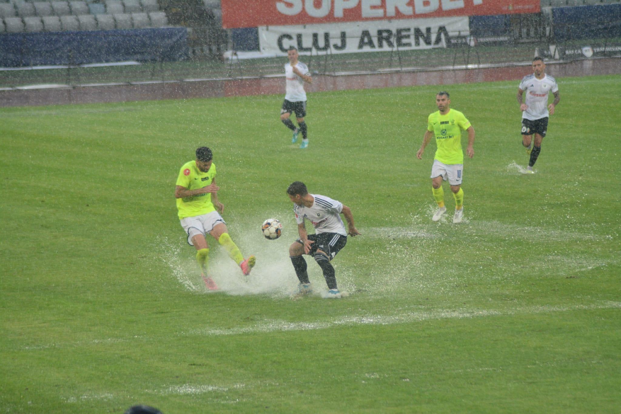 Meciul a fost suspendat pentru că nu sărea mingea din cauza apei. Gazonul a fost schimbat recent din fondurile Consiliului Județean Cluj, dar lucrarea a fost făcută de mântuială.