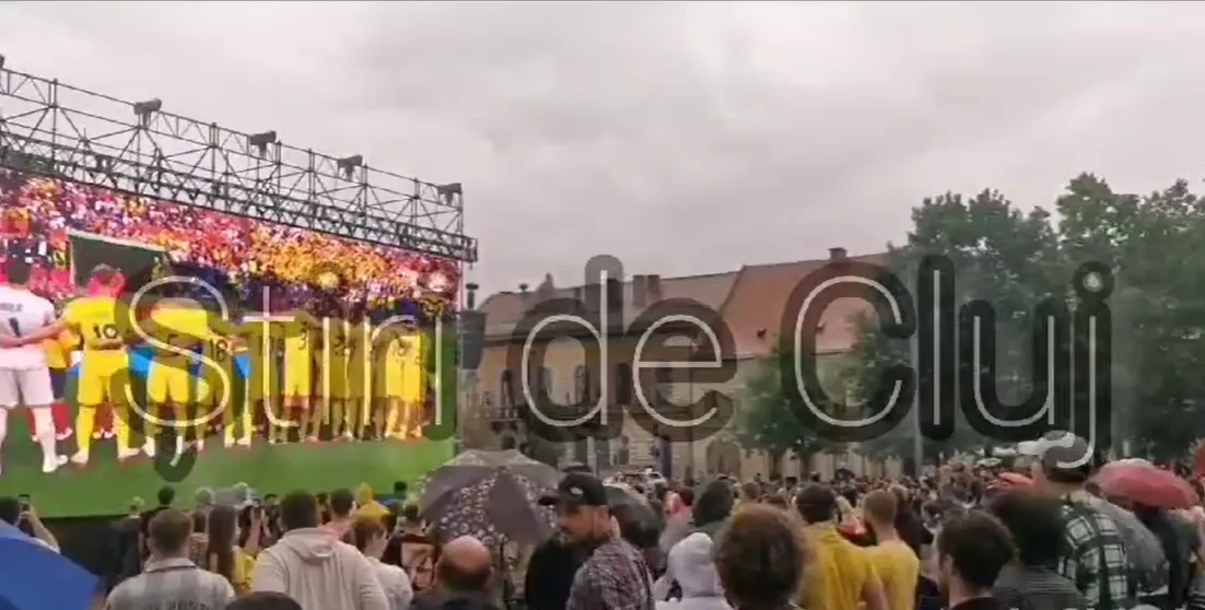 Piața Unirii din Cluj-Napoca a fost martora unui moment de neuitat în această seară, când mii de clujeni au cântat imnul național al României, în ciuda ploii, la începutul partidei România -Olanda.