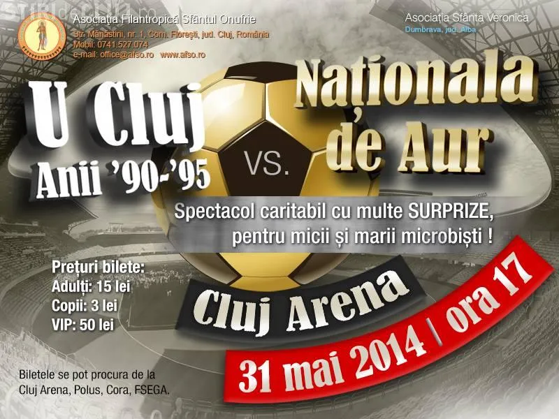 Meciul caritabil dintre Naţionala de Aur a României şi generaţia anilor 90-95 ”U” Cluj face parte din evenimentul caritabil ”Fotbal de aur din suflet pentru copii” și are ca principal obiectiv informarea şi sensibilizarea societăţii civile faţă de problematica copiilor părăsiţi, aflaţi în dificultate precum şi strângerea de fonduri pentru continuarea lucrărilor la Așezământul Social pentru copii Sfântul Onufrie de la Mănăstirea Tăuți, județul Cluj.