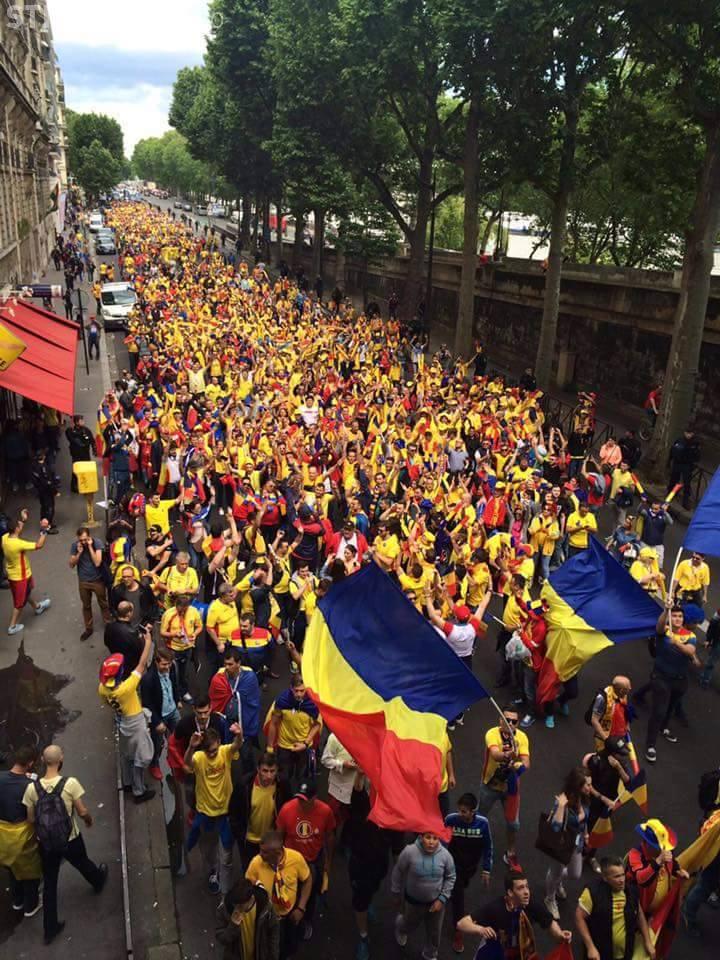 Fanii naționalei, costumați în tricouri galbene și cu steaguri mâini, au mărșăluit spre stadionul pe care se joacă meciul cu Elveția.