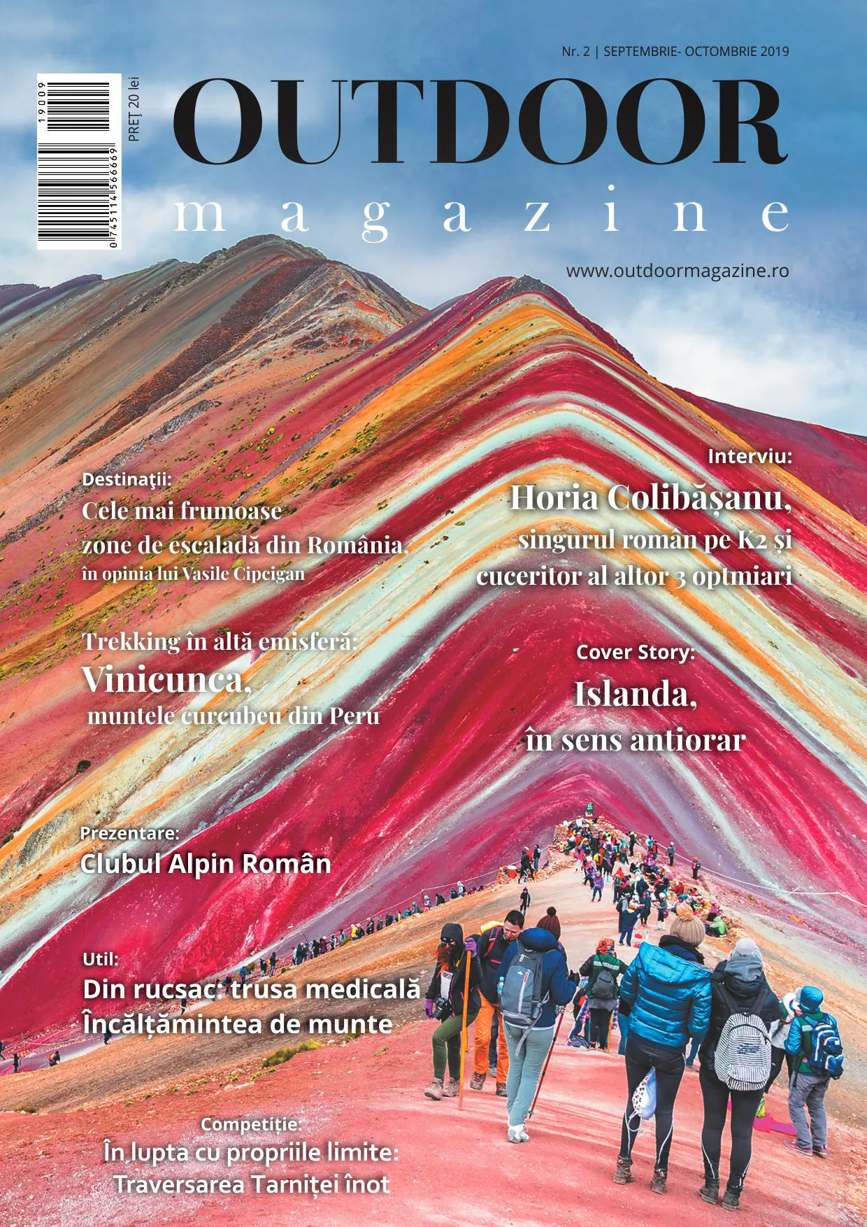 Noua ediție Outdoor Magazine (septembrie-octombrie 2019) invită, de la bun început, la o ascensiune pe Vinicunca sau Muntele celor șapte culori din Peru. Însoțit de poze care își taie răsuflarea, articolul se constituie într-un jurnal de călătorie pe unul dintre cei mai spectaculoși munți ai lumii. Și coverstory-ul prezintă locuri desprinse parcă din altă lume, în Islanda. Interviul ediției îl are ca protagonist pe Horia Colibășanu, singurul român care care a ajuns pe vârful K2.