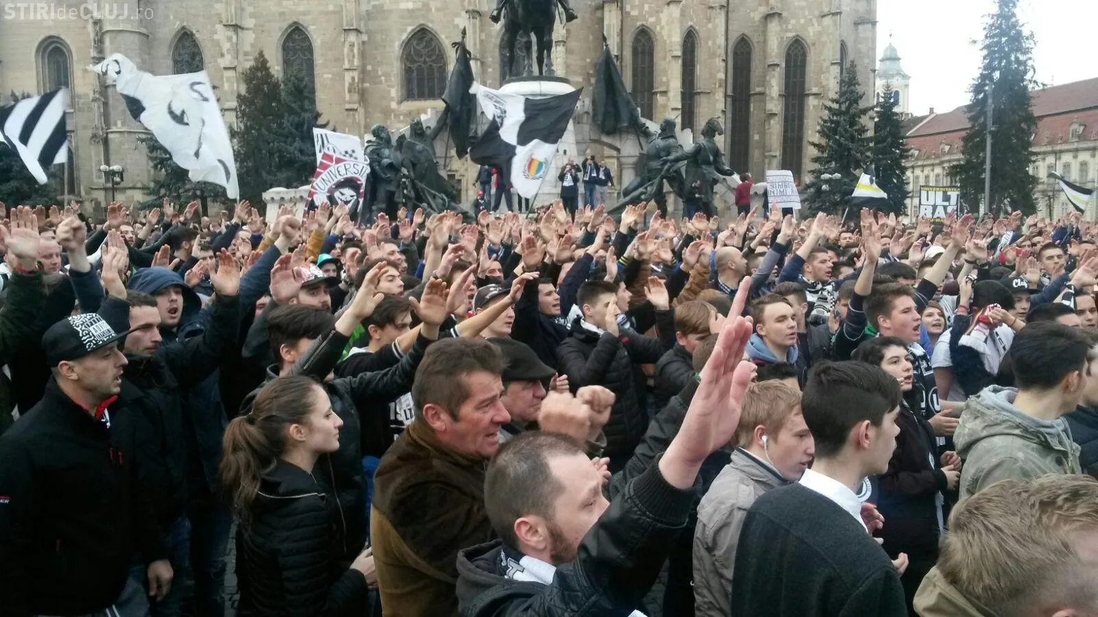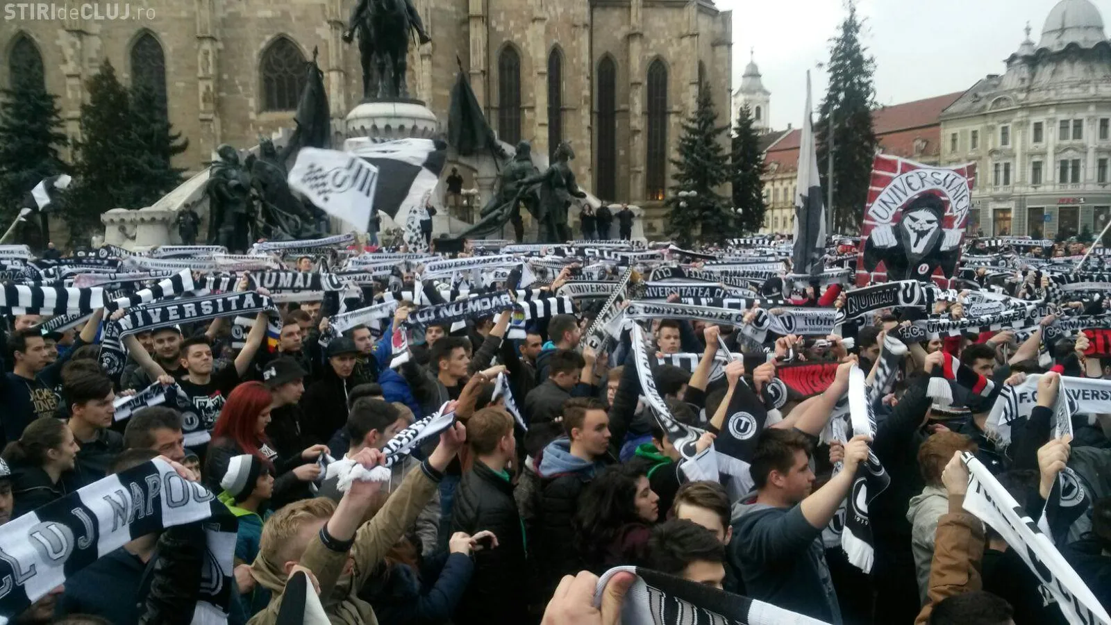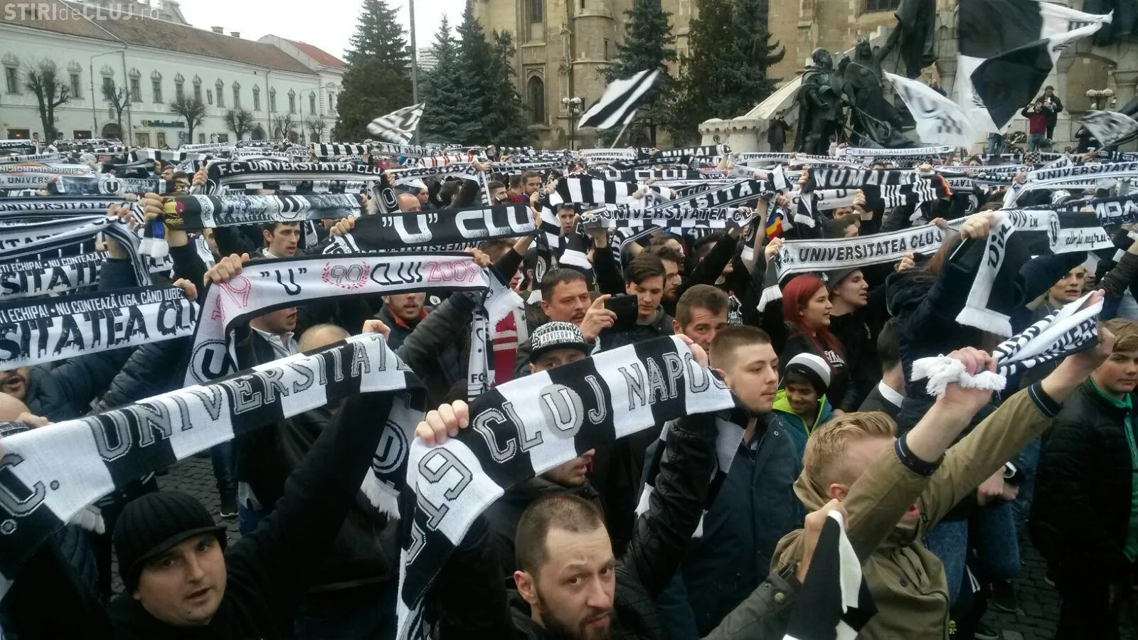 Peste 5.000 de suporteri ai Universității Cluj au ieșit în stradă, în Piața Unirii, joi după-amiaza, pentru a-și susține echipa de suflet, care se confruntă cu grave probleme financiare.