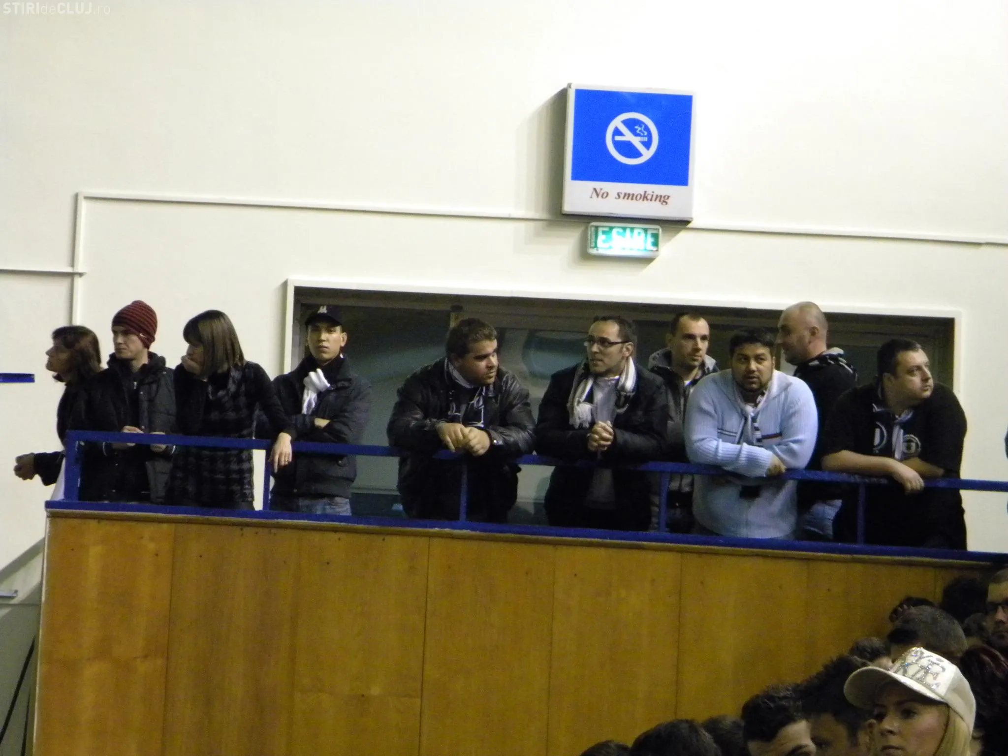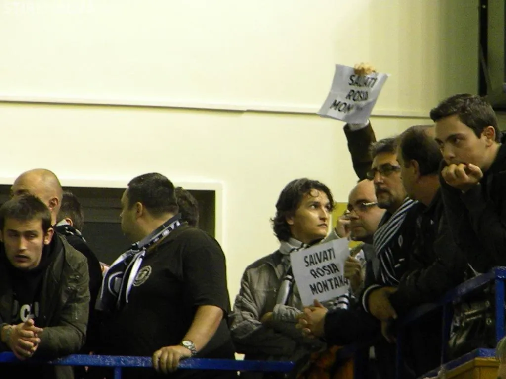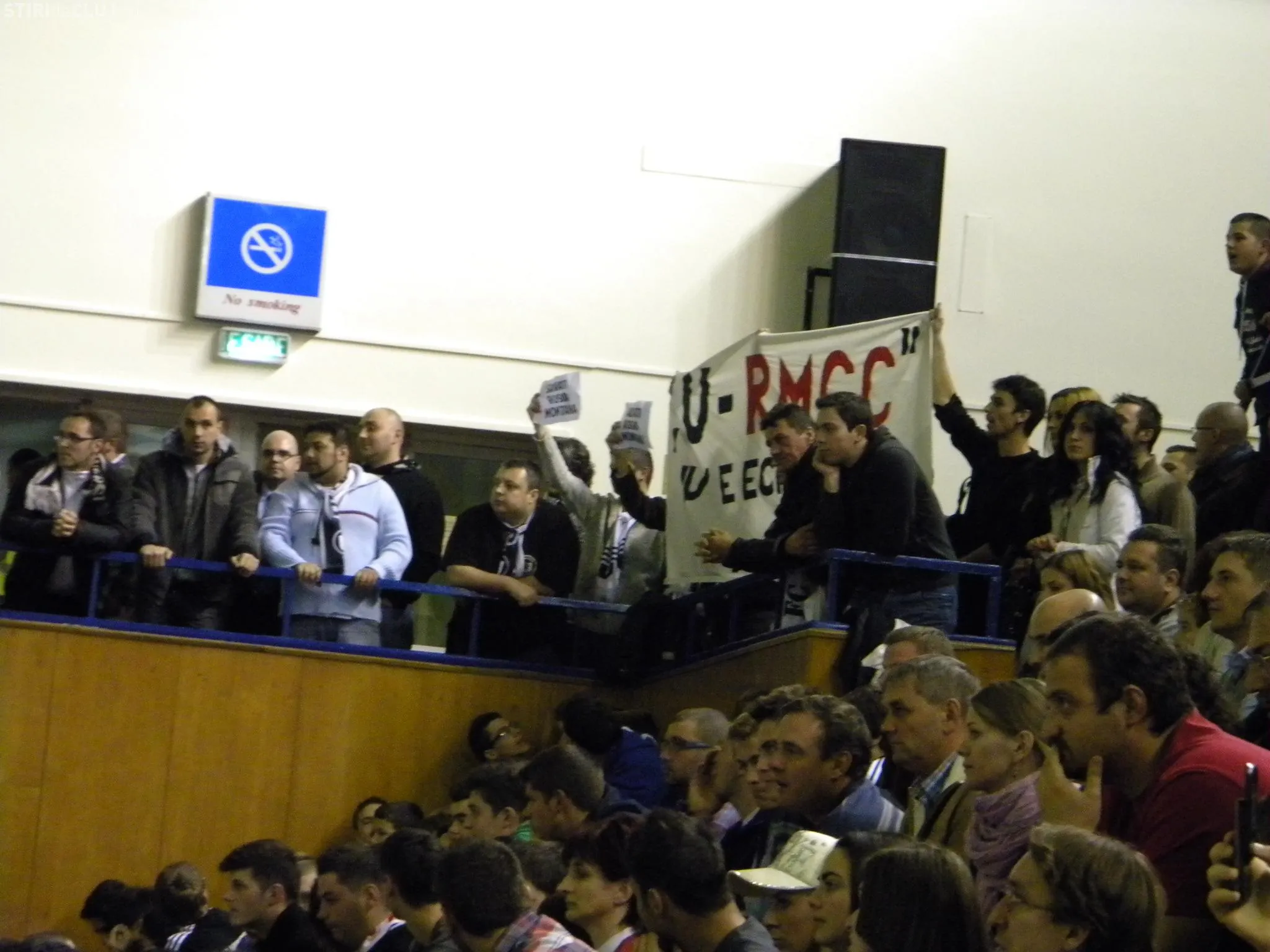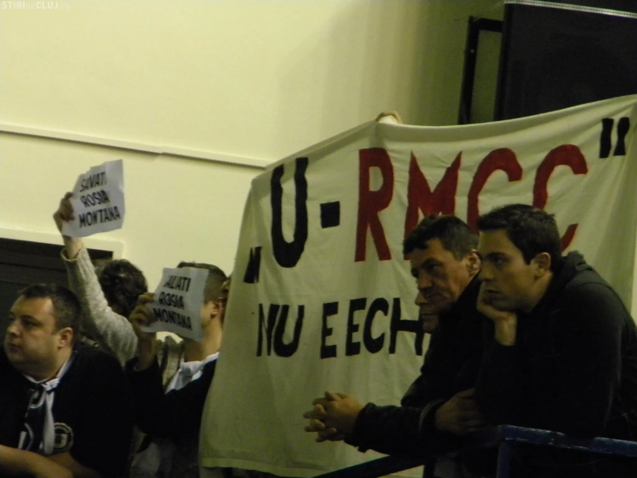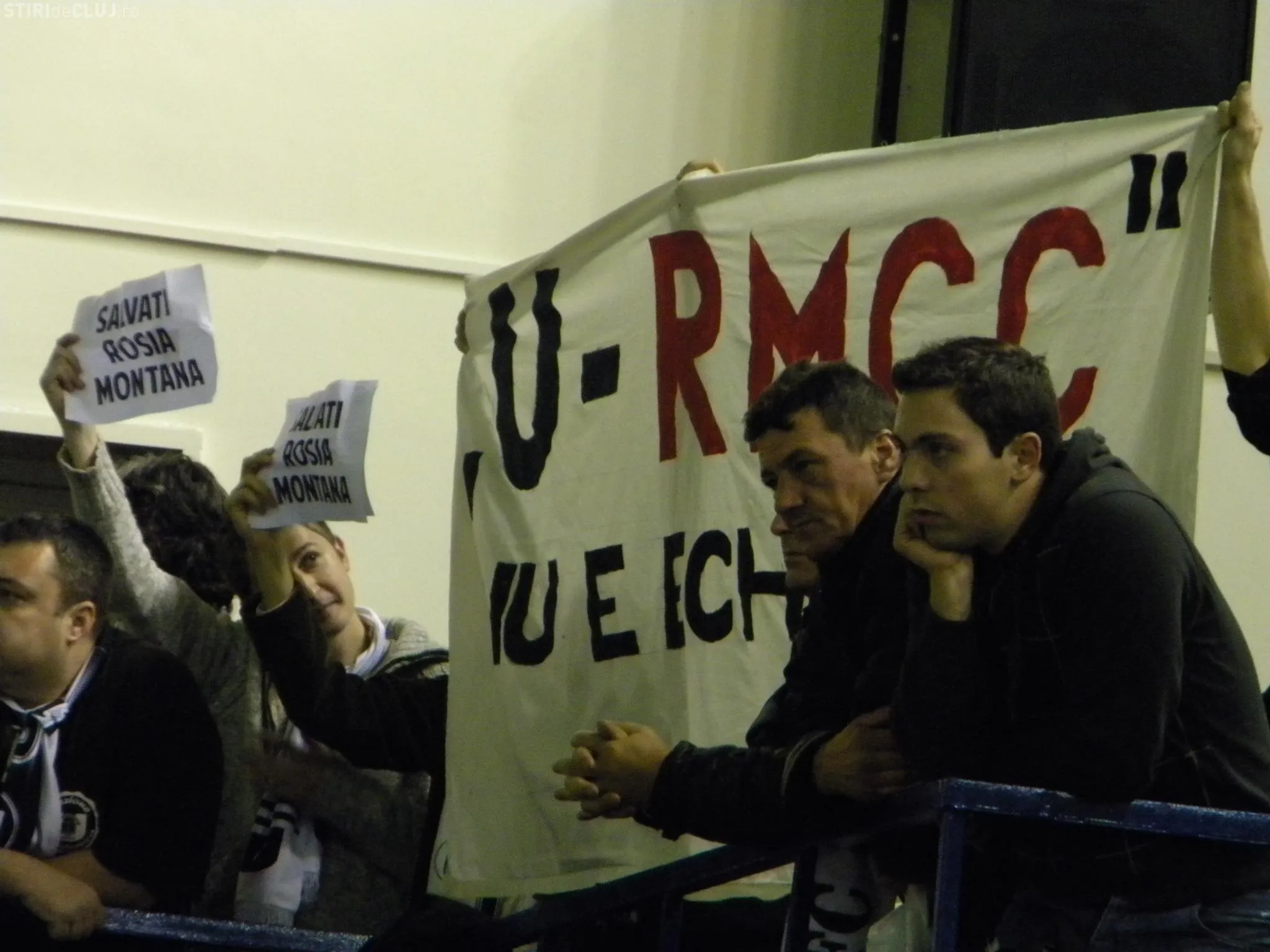 Suporterii U Cluj au protestat la meciul dintre U Mobitelco si Elan Chalon fata de contractul de sponsorizare dintre Rosia Montana Gold Corporation si echipa de baschet.
