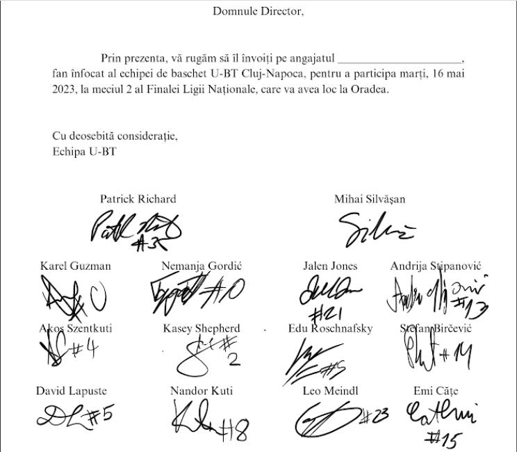 Jucătorii și antrenorul, Mihai Silvășan, au semnat „învoirea” angajaților clujeni, pentru a putea face deplasarea la meciul 2 al Finalei Ligii Naționale, care va avea loc la Oradea marți, 16 mai.
