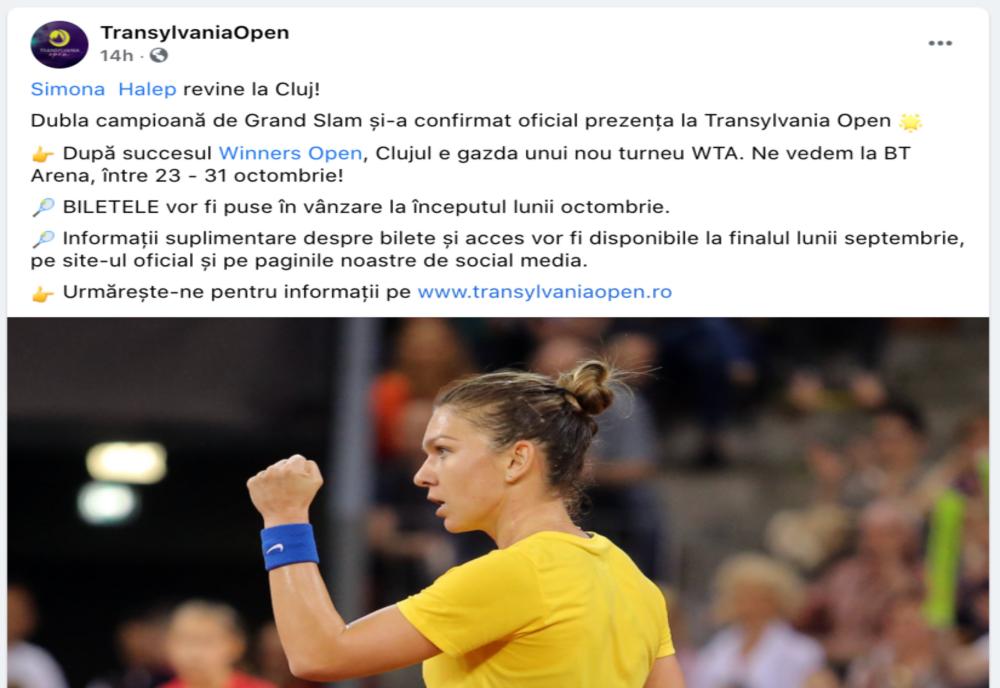 Simona Halep va participa și la turneul pe hard Transylvania Open, în Sala Polivalentă din Cluj-Napoca, programat între 25 și 31 octombrie.