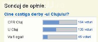 Cititorii Stiri de Cluj au intrat in atmosfera creata in partidei U Cluj - CFR Cluj si au votat in numar mare in sondajul postat pe site. Putini au spus, insa, ca meciul se va termina la egalitate.