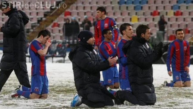 Jucatorii Stelei, in frunte cu managerul Mihai Stoica, au ingenunchiat pe teren in fata suporterilor la finalul meciului cu FC Brasov, pierdut cu scorul de 3-0.