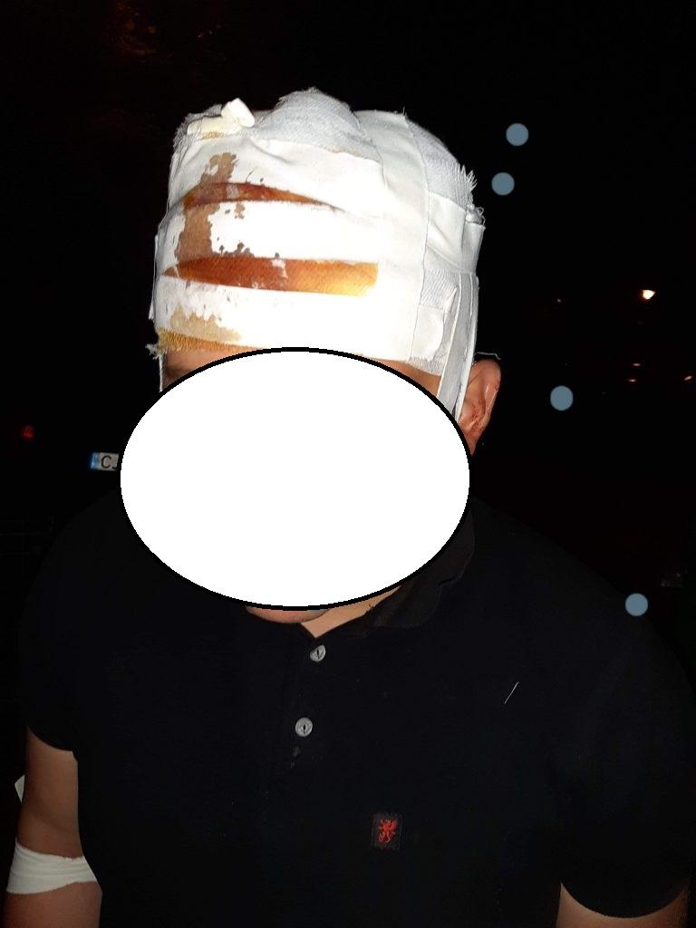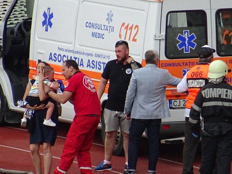 Jandarmul agresat a fost dus la UPU Cluj, de unde a fost transferat la Clinica Neurochirurgie. Directorul medical al Spitalului Clinic de Urgență Cluj, conf. Dr. Adela Golea, a spus: “Pacient în vârstă de 45 de ani, adus de pe stadion unde își îndeplinea funcția de jandarm, a fost diagnosticat la UPU cu traumatism cranio-cerebral, grad 1, fractură cu înfundare parietală stânga, plagă contuză parietală stânga. După evaluare, stabilizare a fost trimis la Clinica Neurochirurgie, unde este în observație pe Secția de Terapie Intensivă”.