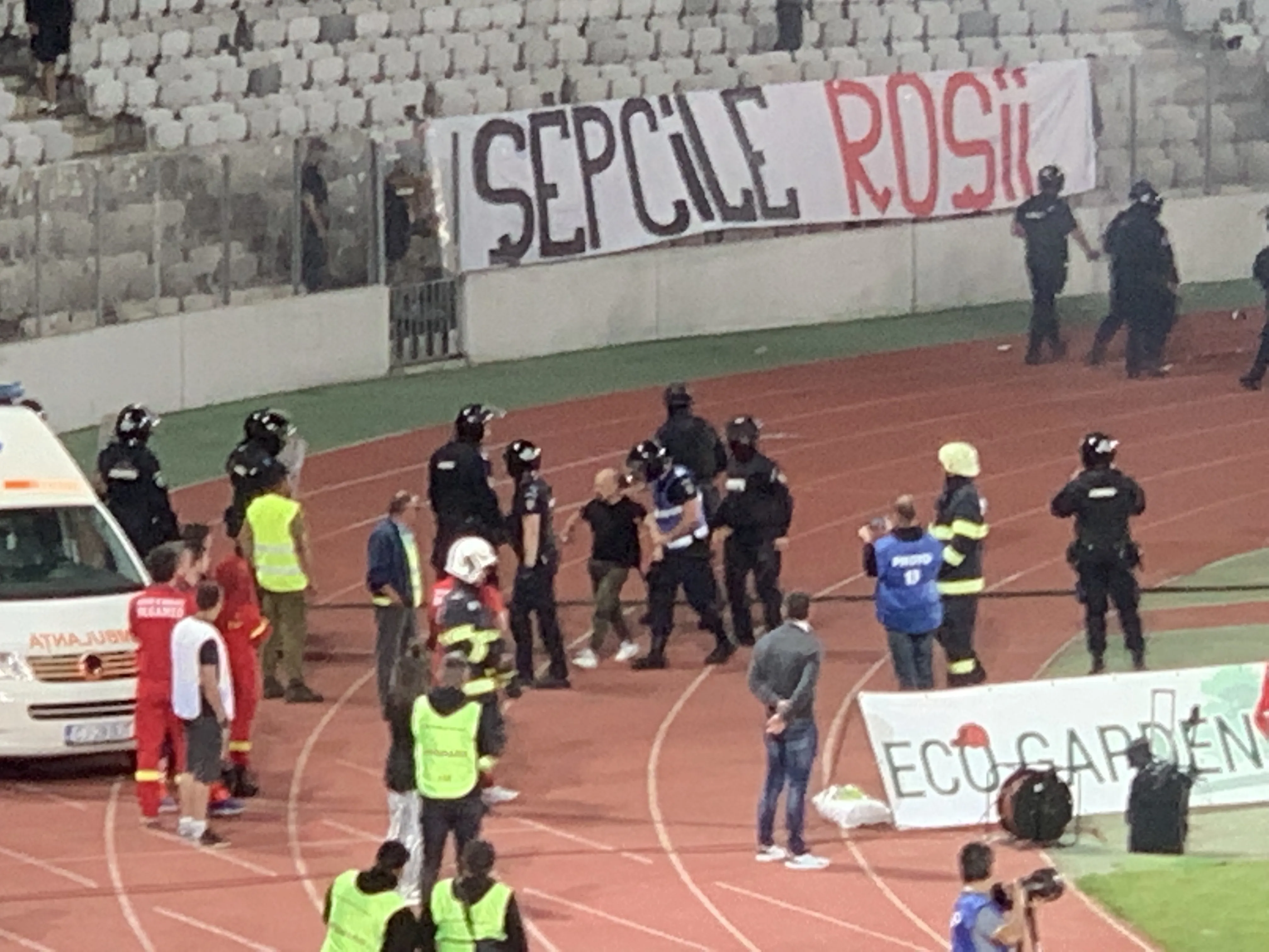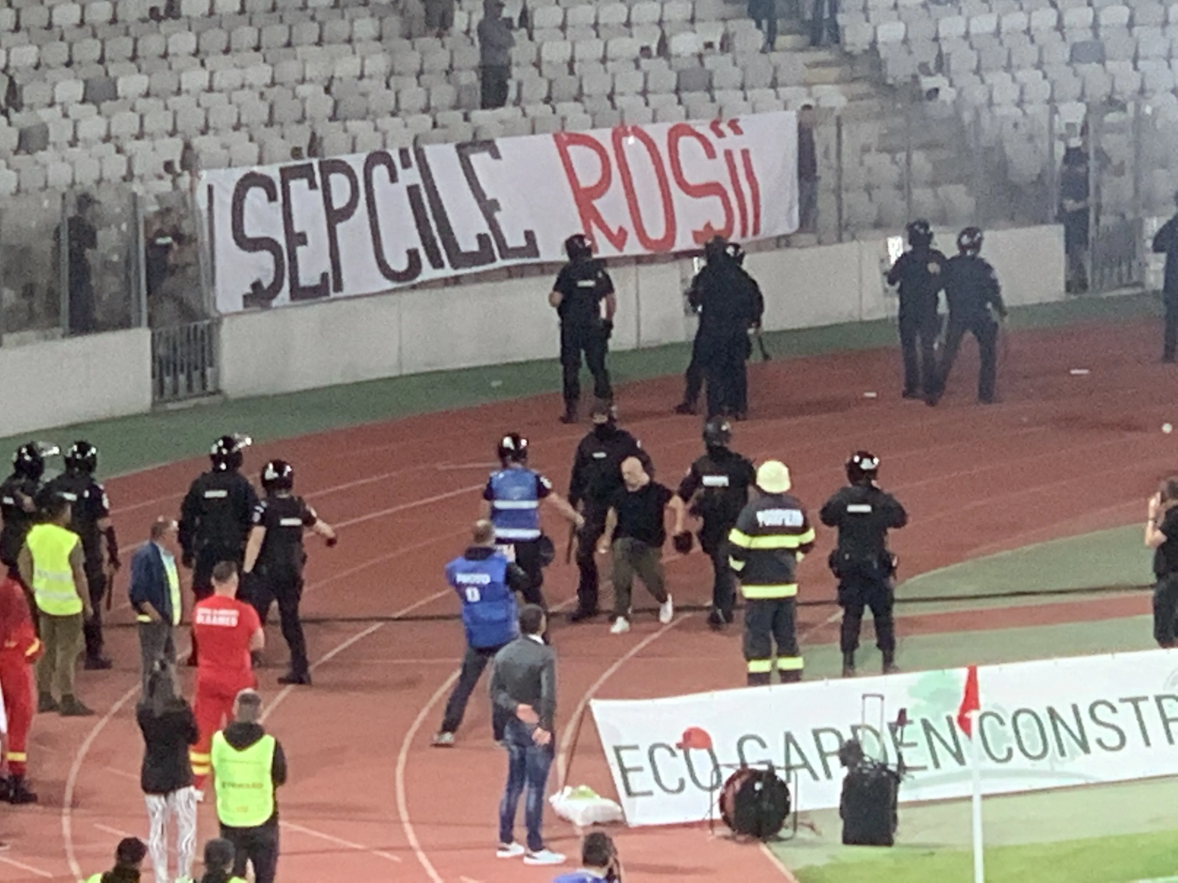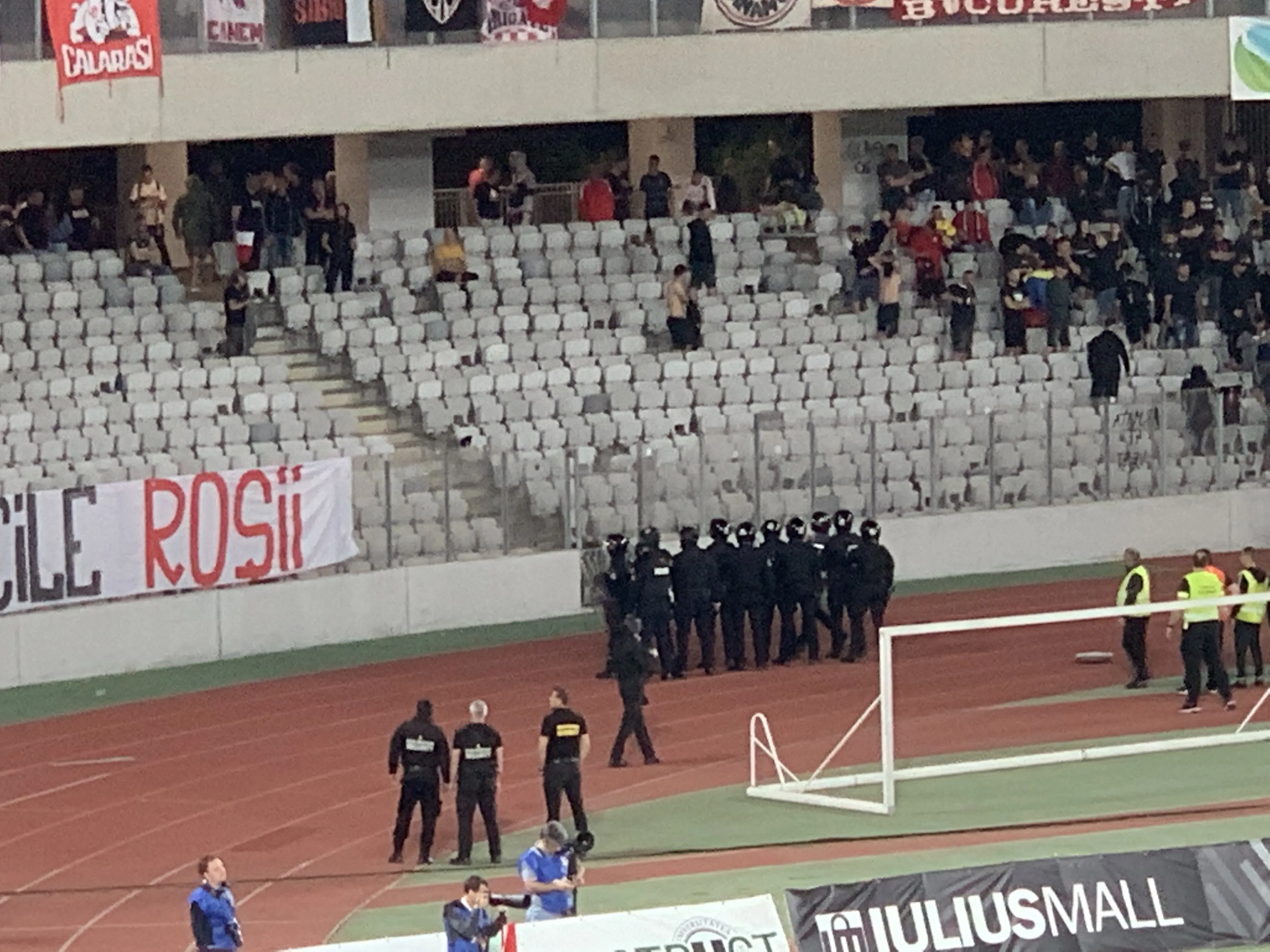 Fanii din Bucuresti au erupt la scorul de 2 - 0 si au fost la un pas de a intra pe teren. Jandarmii au dat cu gaze la lacrimogene si un suporter dinamovist a fost reținut. Acesta a fost amendat, a primit interdicție 6 luni pe stadioanele din România și trimis acasă.