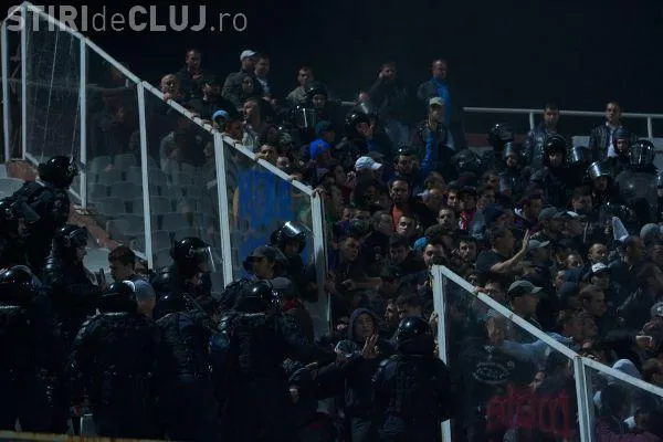 Doar dupa evacuarea galeriei, arbitrul Alexandru Tudor a decis reluarea meciului.
