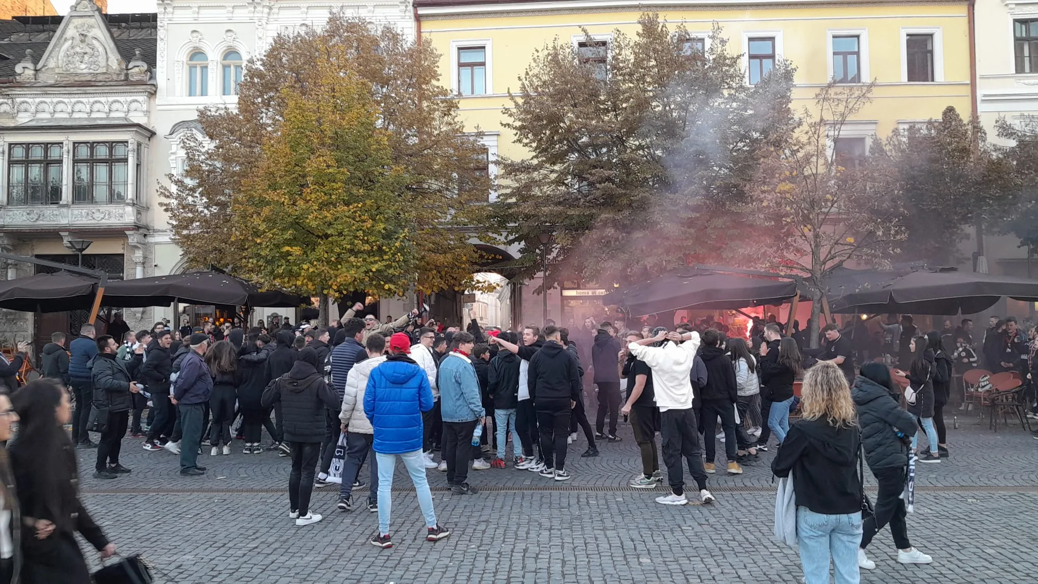 Sute de suporteri ai U Cluj s-au adunat în Piața Unirii, din Cluj-Napoca, pentru a se pregăti de meciul cu CFR Cluj.