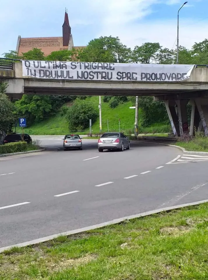 ”Ultima strigare, în drumul nostru spre promovare!”, scrie pe bannerul, care dă drumul febrei dinainte de marele meci contra Hermannstadt.