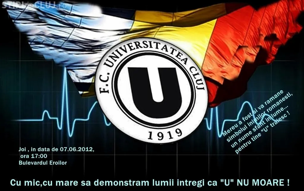 "Toata lumea este asteptata pe data de 07.06.2012 pe Bulevardul Eroilor la ora 17.00 pentru a demonstra intregii tari si nu numai, ca dragostea adevarata si iubirea fata de Universitatea Cluj Napoca depaseste orice imaginatie ! Iesim in strada pentru a arata cine este cu adevarat echipa, pardon singura echipa iubita din Ardeal...CLUJ NAPOCA SUNTEM NOI ! Stiu s-ar putea sa ma contraziceti , da...aveti dreptate in Cluj exista 2 echipe "U" si Sanatatea ! .....numai bine, ne vedem pe 07.06.2012 ora 17:00 pe EROILOR! NUMAI "U" semnez ANONIM!", ne-a scris un cititor.