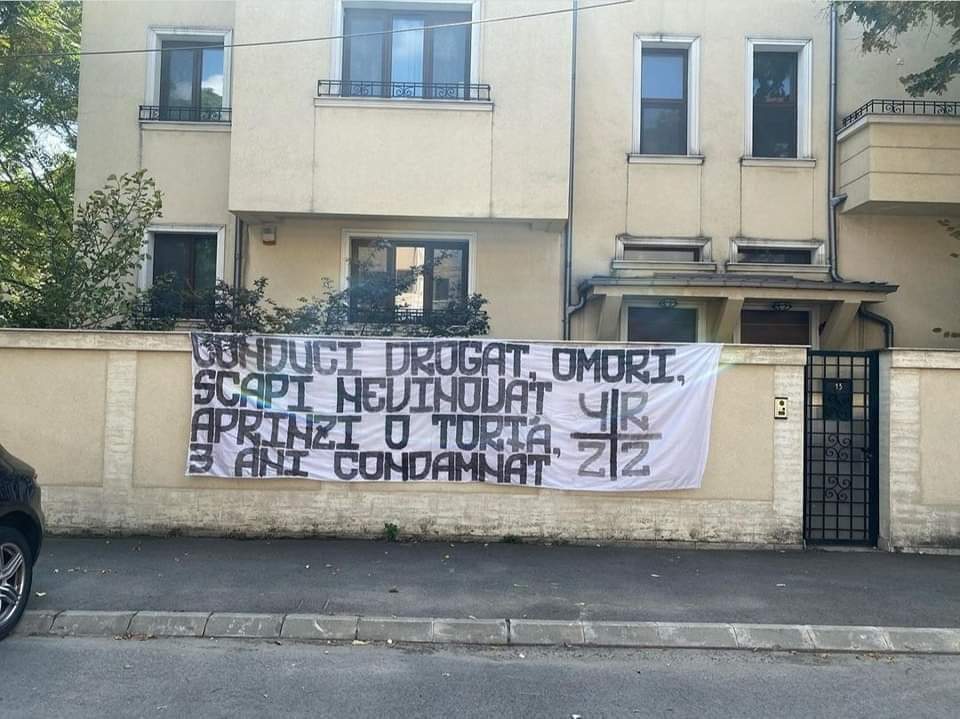 ”Conduci drogat, omori, scapi nevinovat, aprinzi o torță, 3 ani condamnat!”, scrie pe un banner postat de un suporter U Cluj.