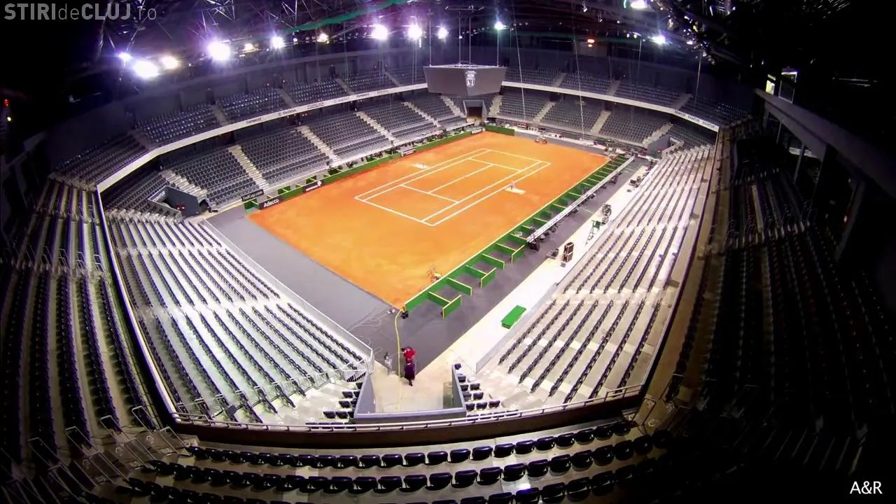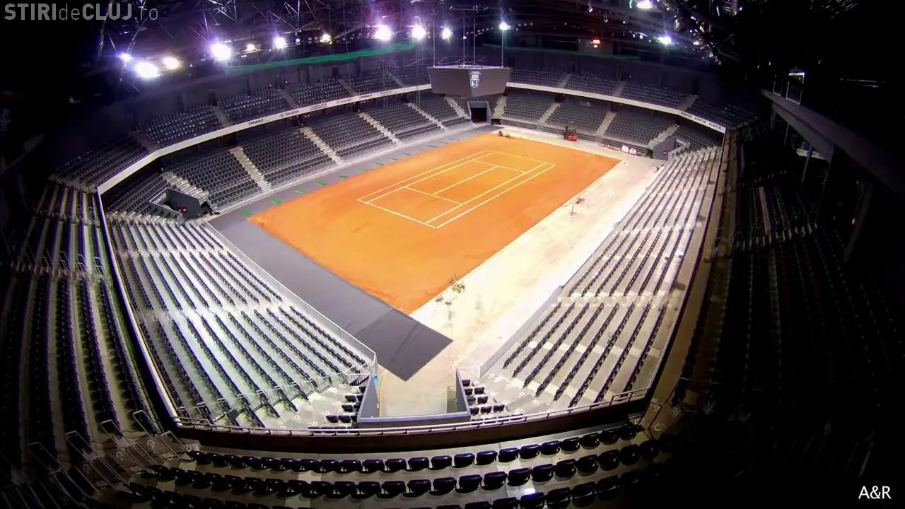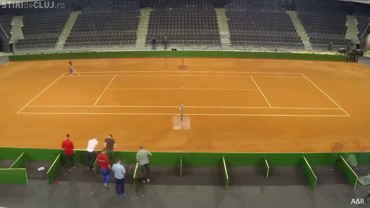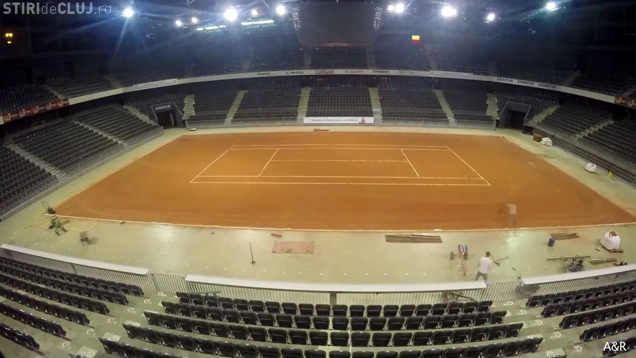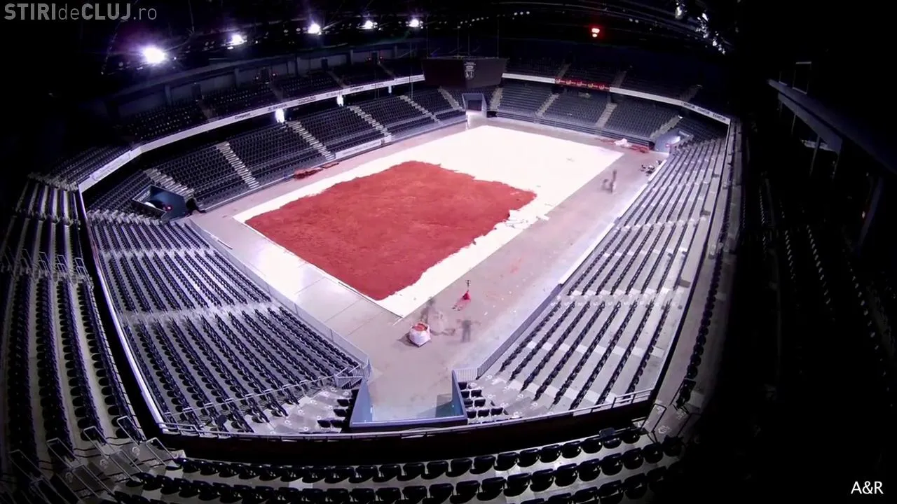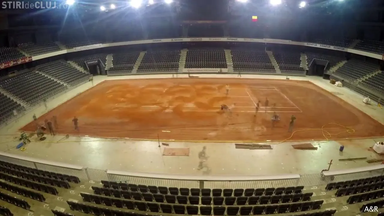 Un time lapse realizat la Sala Polivalentă surprinde momentele transformării acesteia într-o arenă de tenis pe zgură.