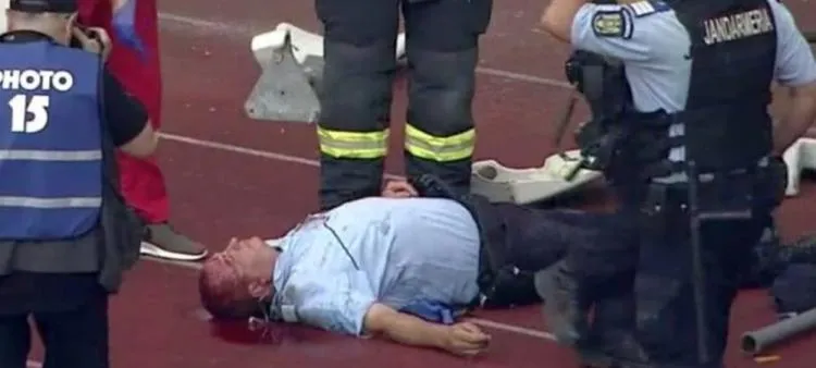 Intervenția jandarmilor i-a întărâtat pe suporteri, care au fost ”gazați” și au fugit în peluză de unde au aruncat cu scaune rupte. Un jandarm care nu era echipat pentru intervenție, cu cască și alte protecții, a fost lovit în cap și a căzut pe jos într-o baltă de sânge, fiind dus la spital unde a stat internat circa două săptămâni. Jandarmul era din echipa de dialog.