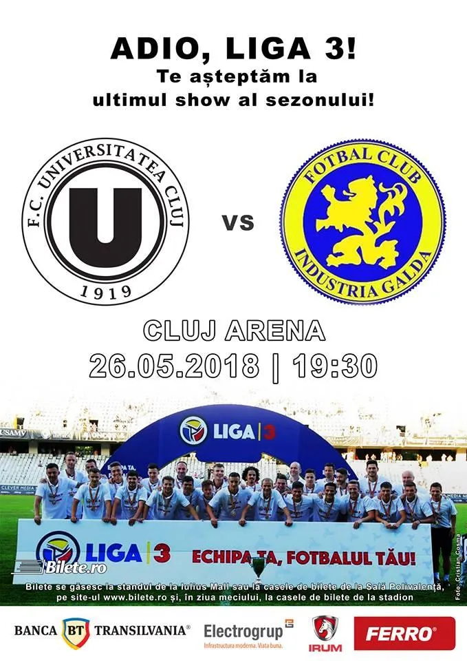 ”Vara e lungă şi ne va fi dor de "U"! Tocmai de aceea, ultimul show al sezonului nu trebuie ratat. Sâmbătă, de la ora 19.30, "U" îşi ia adio de la #Liga3 cu un meci contra Industriei Galda. Bilete găsiţi on-line, în link-ul de mai jos, dar şi la standul clubului din Iulius Mall Cluj, la casa de bilete a Sălii Polivalente Cluj, în magazinele Inmedio, Germanos sau la oficiile Poştei Române