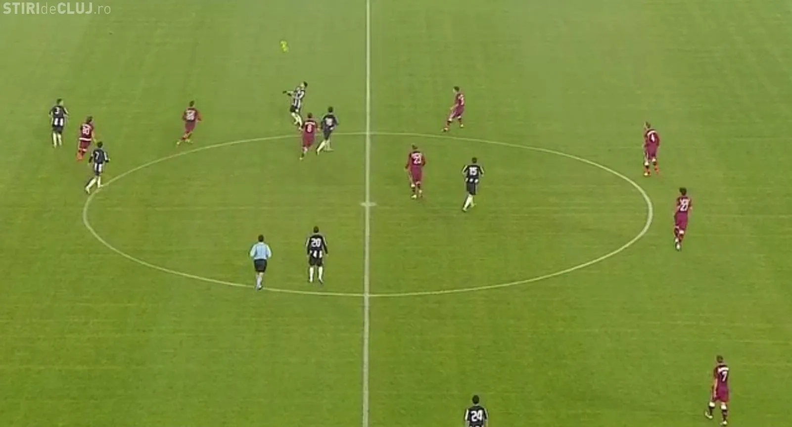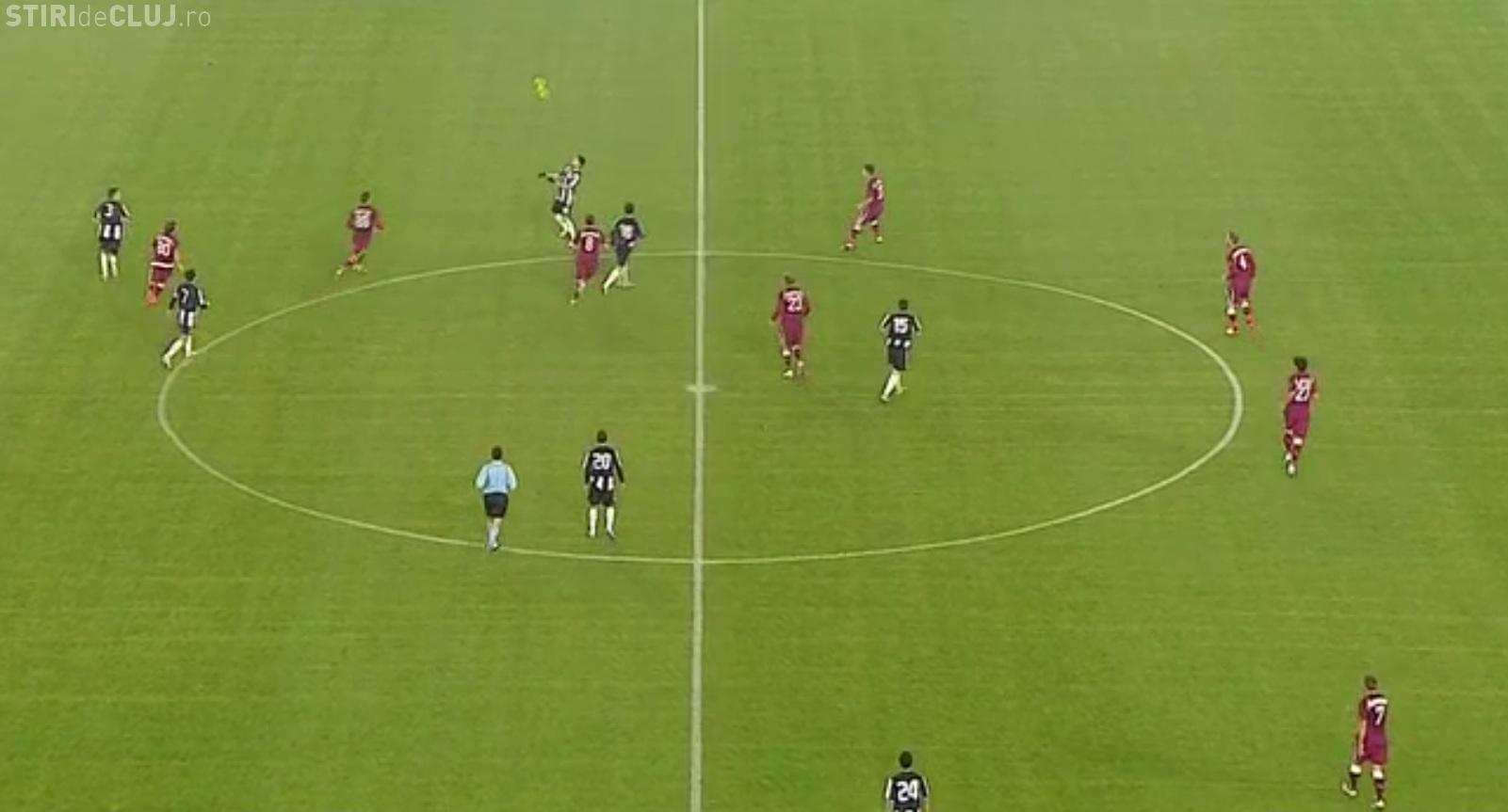 Minutul 83- Grigorie i-a furat o minge unui jucător de la U Cluj și a șutat de la 40 de metri. Balauru era ieșit din poartă, dar a revenit și a scos mingea care mergea în plasă