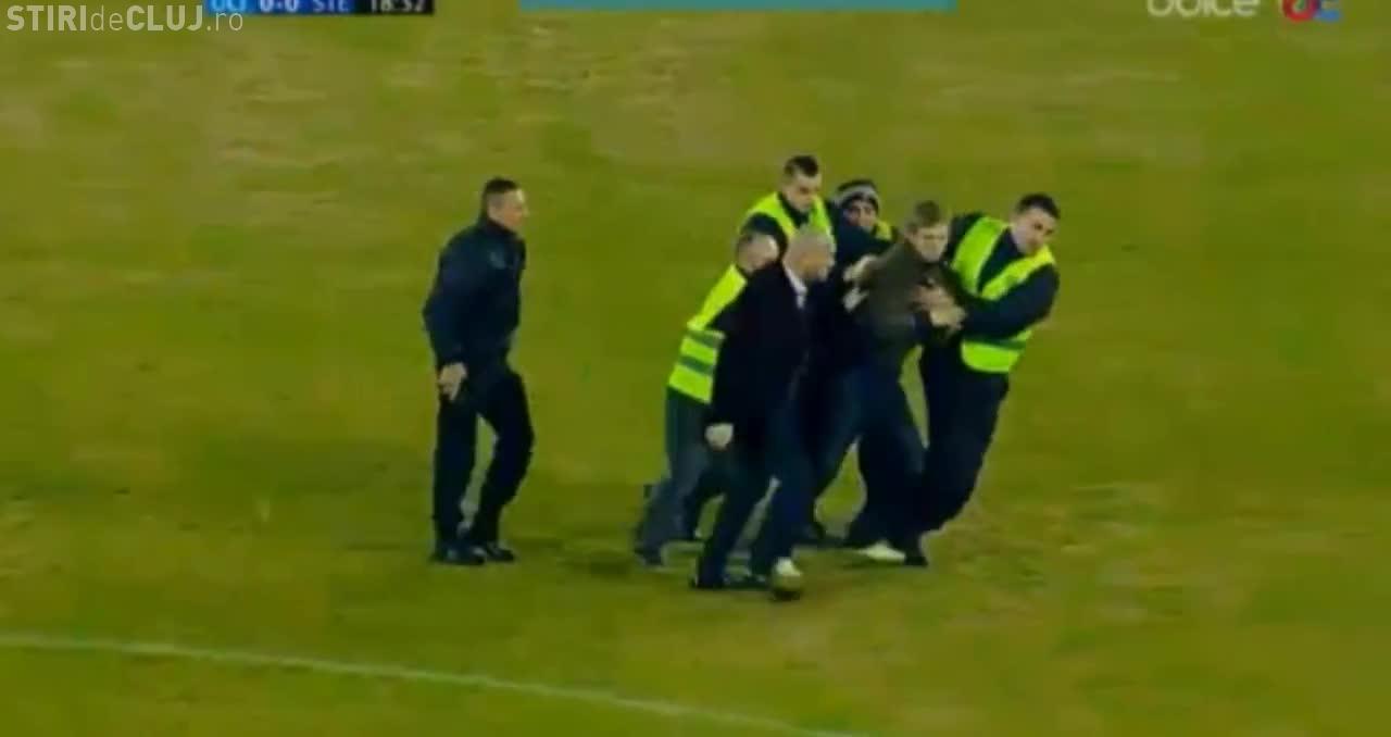 Forțele de ordine au intervenit rapid și l-au scos afară pe suporter. Suporterul U Cluj s-a întreptat cu mâinile în aer direct spre portarul Stelei, Tătărușanu.