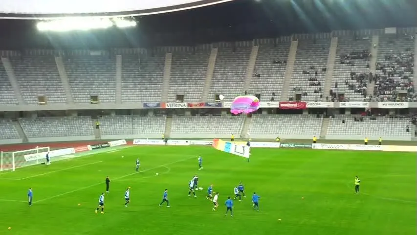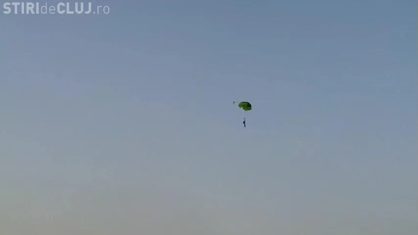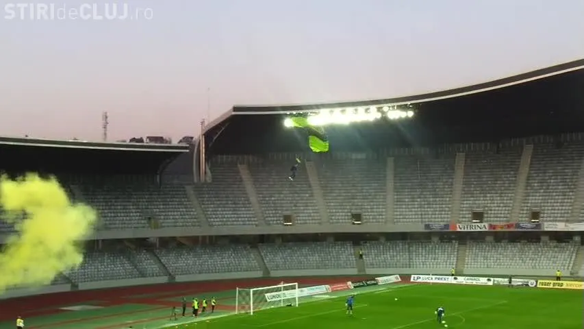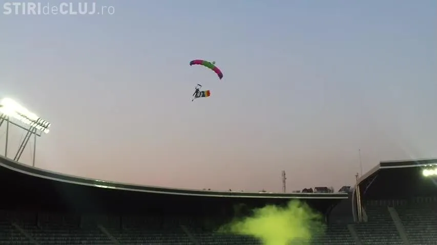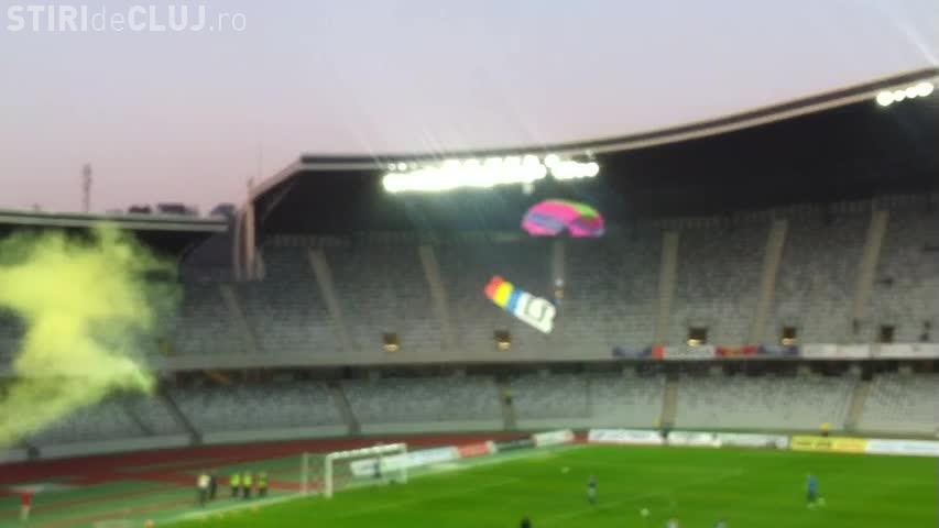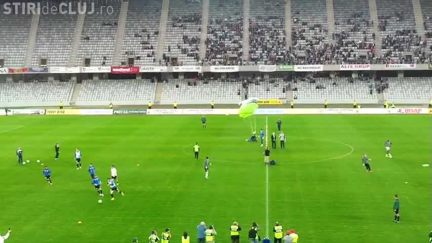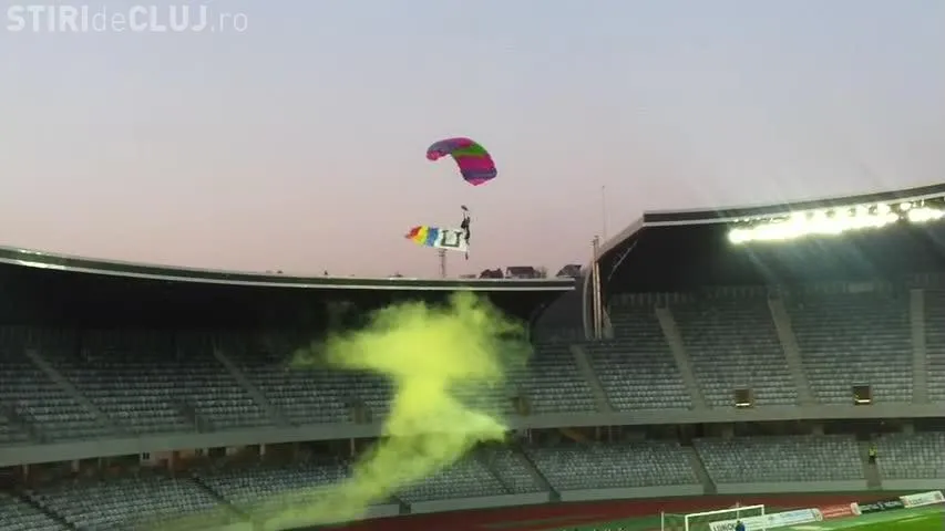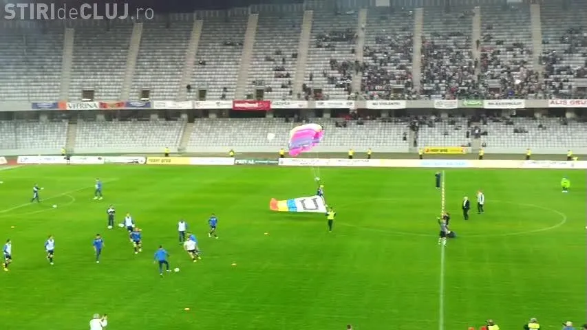 Un parașutist a aterizat pe Cluj Arena, înainte de U Cluj - Gaz Metan Mediaș, aducând pe stadion cartea ”Șepcile Roșii”, scrisă de regretatul Ioan Chirilă.