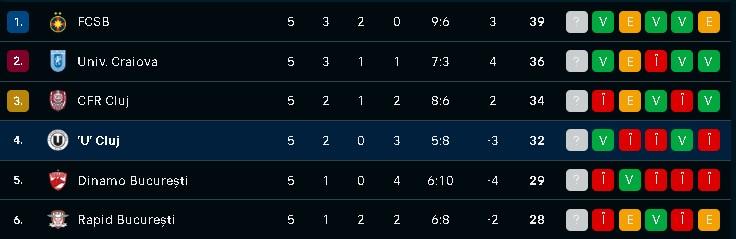 În momentul de față , Universitatea Cluj se află pe locul 4 în Superliga cu 32 de puncte. De asemenea, Universitatea Craiova are 36 de puncte și se află pe locul 2, fiind la 3 puncte distanță de liderul FCSB.