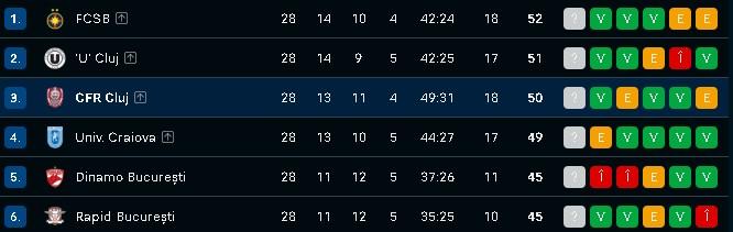 În momentul de față, Universitatea Cluj se află pe locul 2 în Superliga cu 51 de puncte, fiind la un singur punct distanță de FCSB. Mai mult, în cele 28 de etape jucate, „studenții” au reușit să marcheze 42 de goluri, la fel ca FCSB.
