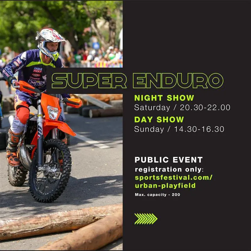 SUPER ENDURO SHOW aduce în inima orașului unul din cele mai extreme sporturi! Circuitul moto va fi creat astfel încât să ofere un adevărat spectacol publicului și să provoace motocicliștii să facă față unui circuit sălbatic, dar urban. Traseul va fi străbătut de 20 dintre cei mai pricepuți bikeri, parte din comunitatea Sports Festival, care vor concura pentru titlul de Cel mai bun BIKER URBAN ENDURO.