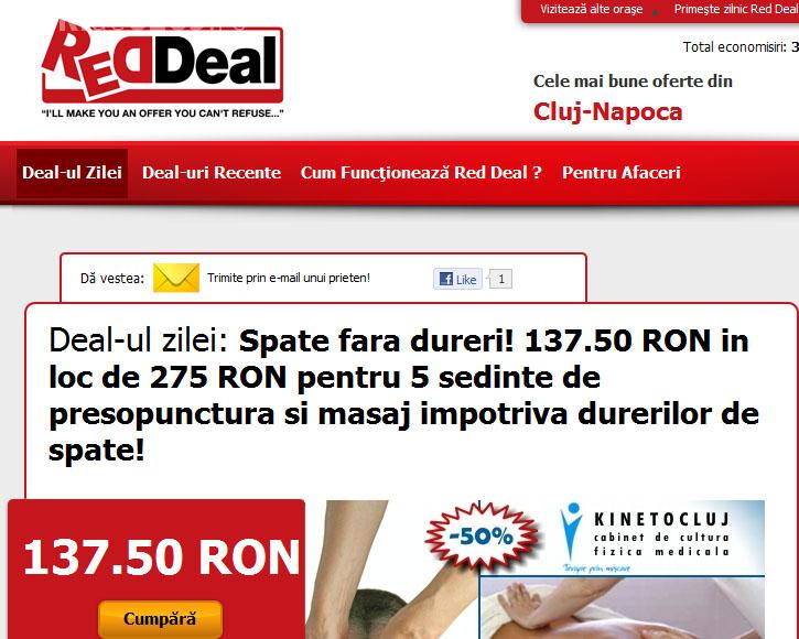 Sedintele sunt oferite de Red Deal la salonul Kinetocluj de pe strada Donath nr 24. Fiecare sedinta are minimum 60 de minute si include presopunctură şi masaj împotriva durerilor de spate.