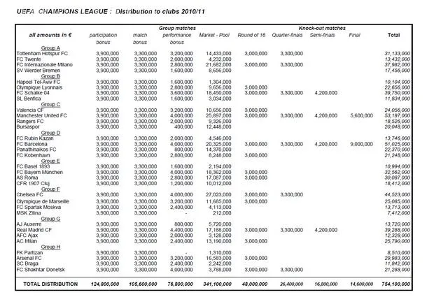 UEFA a fost publice sumele pe care le-a incasat fiecare dintre echipele care au jucat in Liga Campionilor si in Europa League in sezonul trecut.