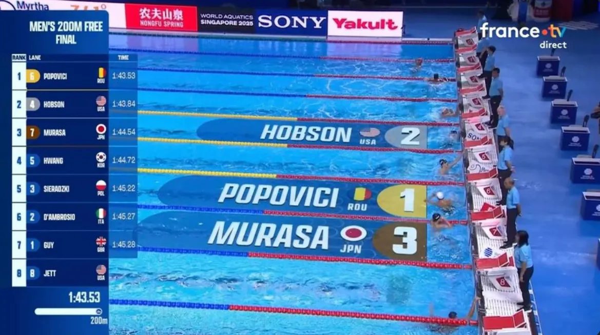 David Popovici (20 de ani) a câștigat medalia de aur în proba de 200 metri liber la Campionatele Mondiale de natație din Singapore, terminând cele 4 lungimi de bazin în 1:43,53. Aceasta reprezintă a doua sa victorie mondială, după succesul din 2022 de la Budapesta. De asemenea, Popovici deține și titlul olimpic și pe cel european la această probă.